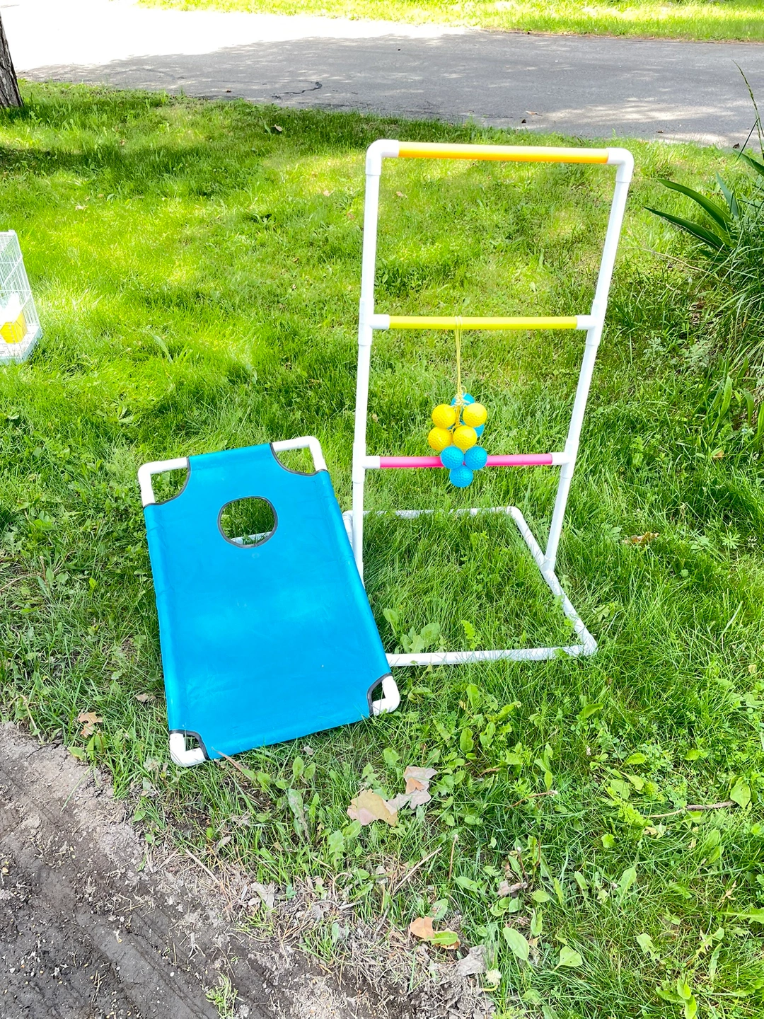 91This is a ladder toss game and a bean bag toss game. Both are made of PVC pipe. The ladder toss comes with strung balls and the bean bag toss can be used with bags or balls.