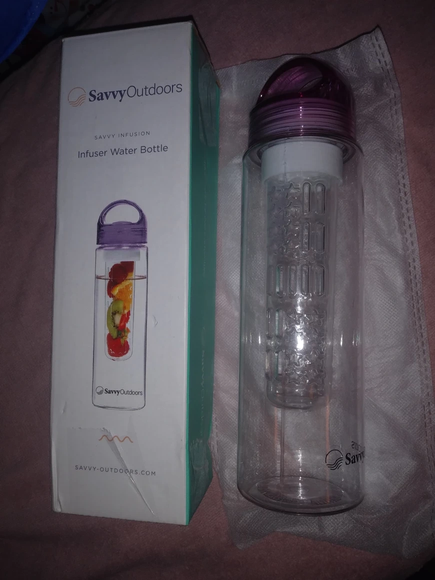 A 24 oz lavender water bottle with a fruit infuser. It is made from Tritan shatterproof plastic and includes a leak proof silicone sealed cap. This bottle is dishwasher safe.