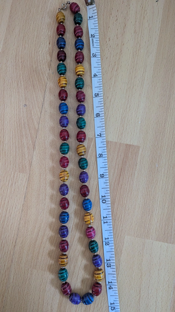 A colourful beaded necklace with silver accents. The necklace has a variety of bead colours including green, red, blue, purple and yellow.