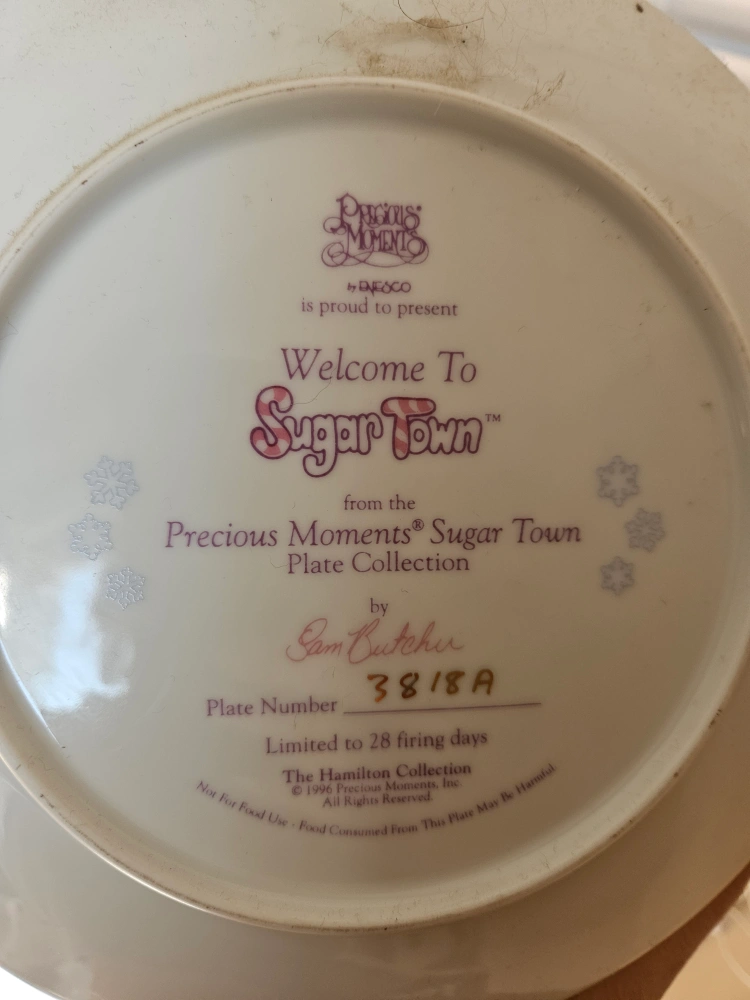 A 1996 collectible plate from the Precious Moments Sugar Town Plate Collection.