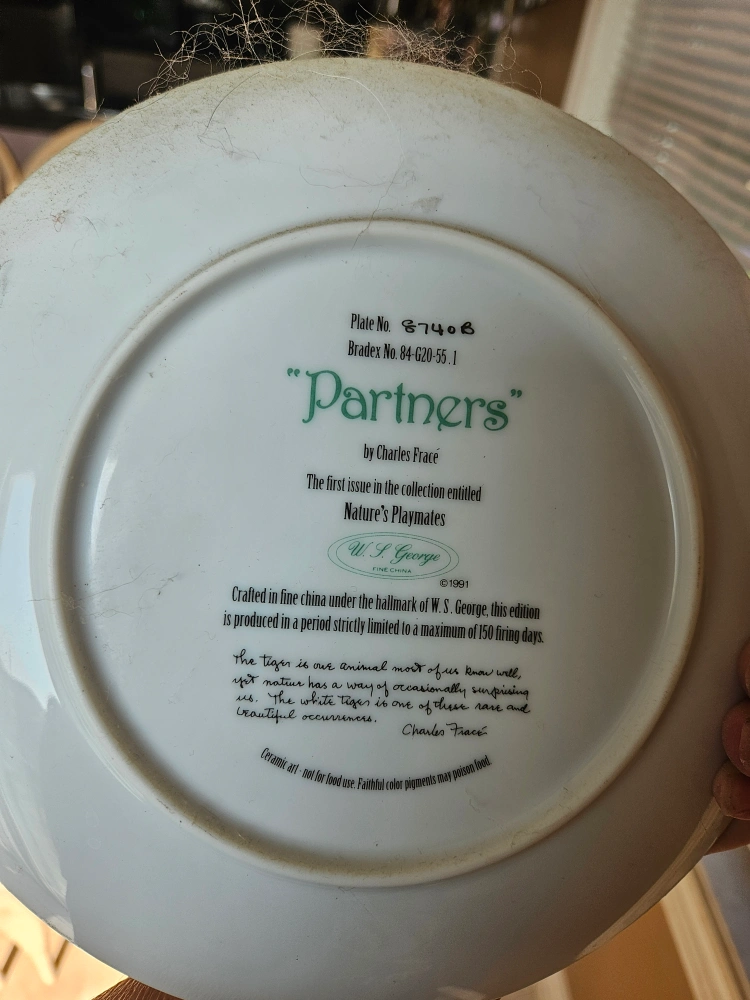 A "Partners" plate from the "Nature's Playmates" collection by Charles Frace. The plate depicts two white tiger cubs in a forest. The back of the plate has a sticker with the plate number and information about the plate.