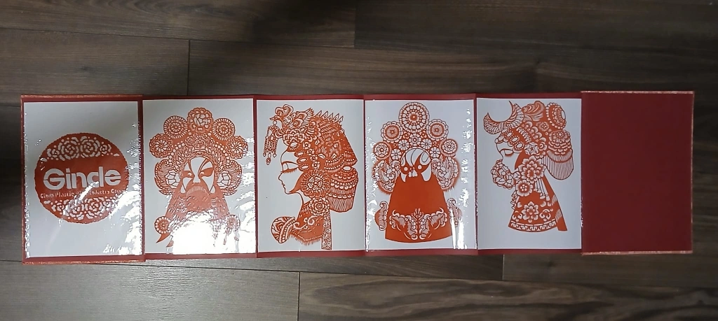 Set of 4 paper cuts in a hard-cover book. The paper cuts are of people in traditional Chinese dress.