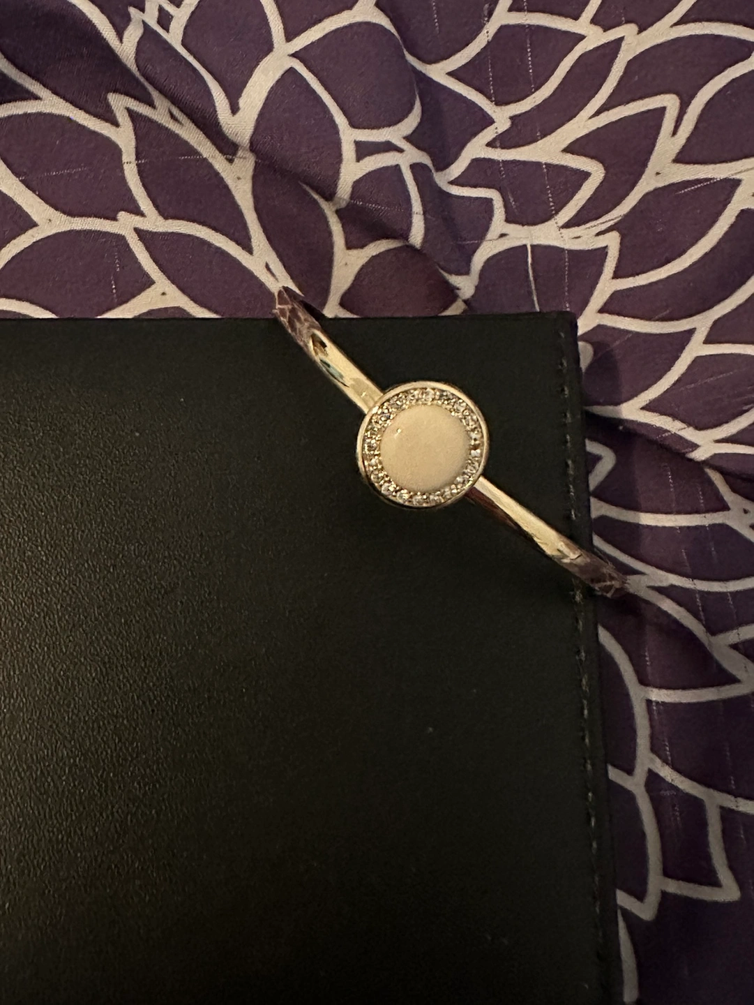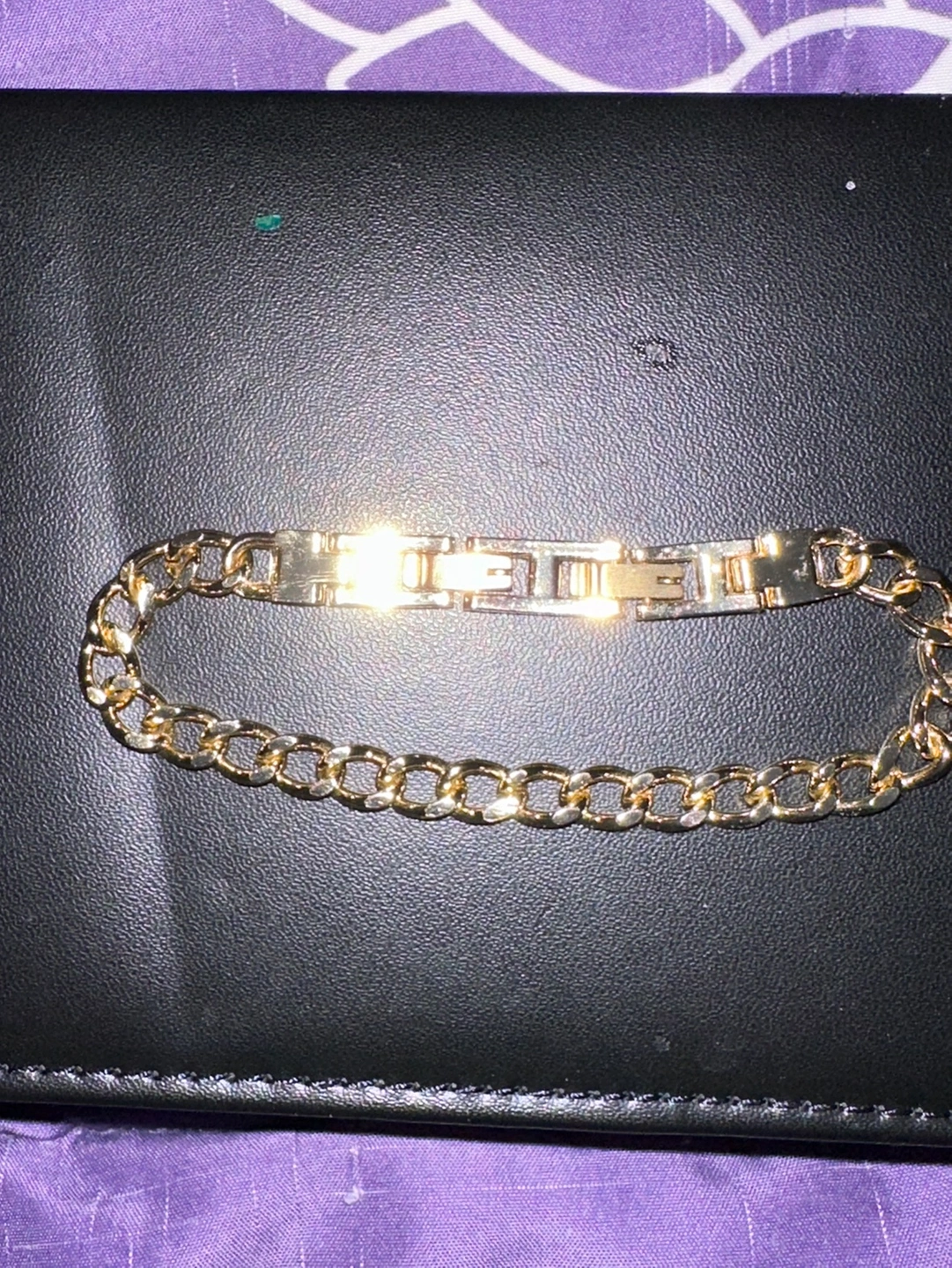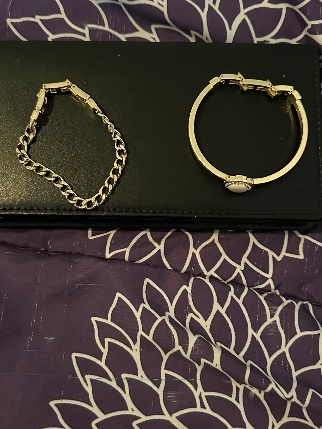 Two gold tone bracelets. One is a curb chain bracelet and the other is a bangle with a round stone. Brand new, both have adjustable clasps as seen in 3rd photo