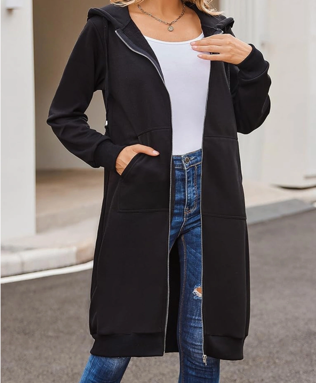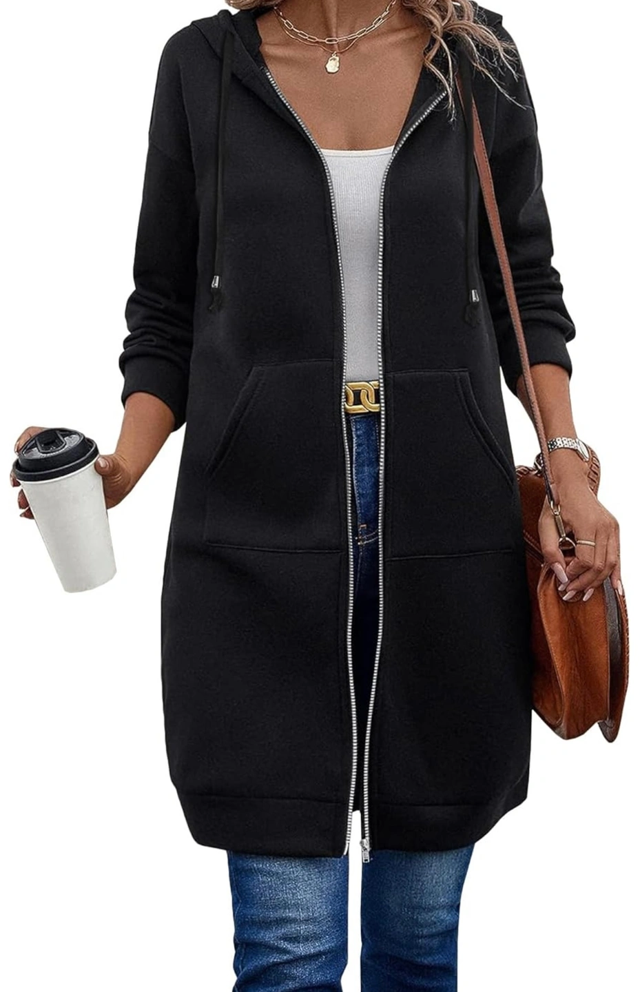 Black Longline hooded jacket with a full length zipper. It features two pockets and ribbed cuffs and hem. Material: Cotton Blend and Fleece,most stylish and premium zip up hooded fleece jacket which can be worn during autumn and winter season to keep you warm. Features: Zipper Up,Long Sleeve,Drawstring hood and zip fastening,Side Pockets,Knee Length,casual loose style,long hoodie tunic Style: This thin thermal knitted hoodie jacket is perfect to wear in any casual occasion including jogging, lounging, and vacation. Occasions: The long tunic sweatshirt is great for many occasions, such as casual, outdoor, home, party, work, shopping. Perfect pair it with leggings, high heels,boots etc