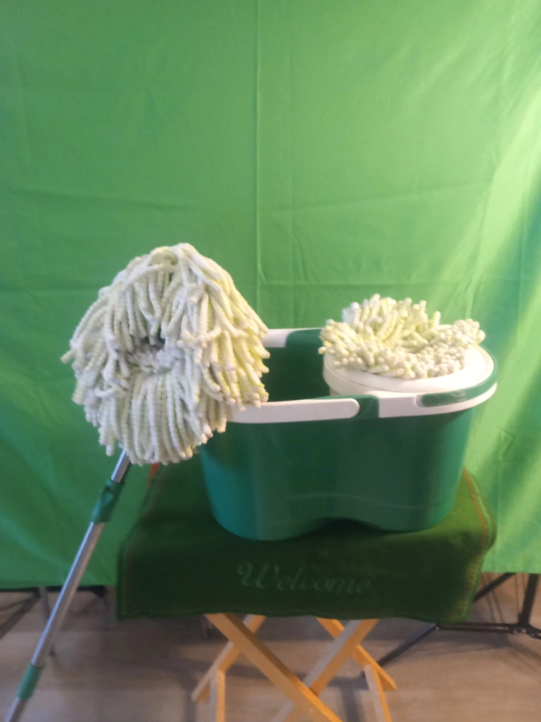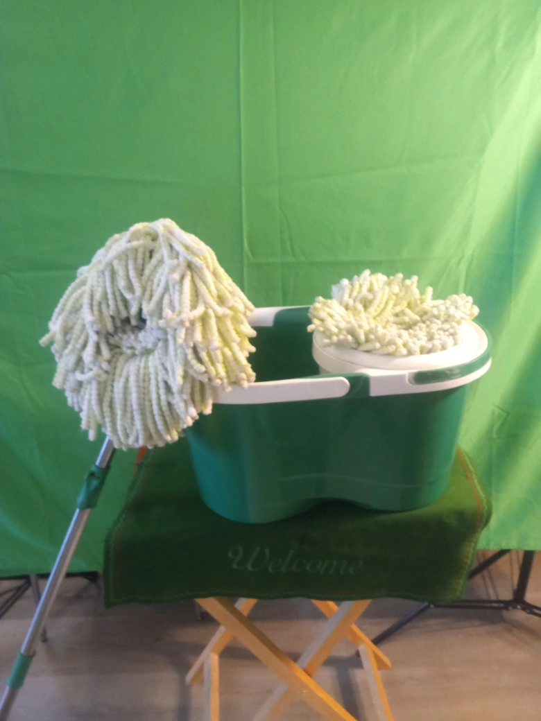 Green and white spin mop and bucket set. Includes two mop heads and one bucket with a wringer.