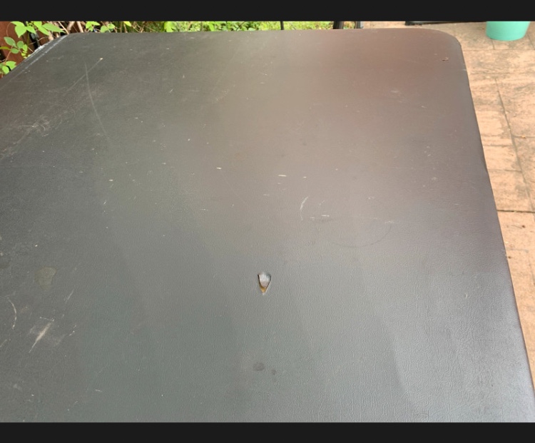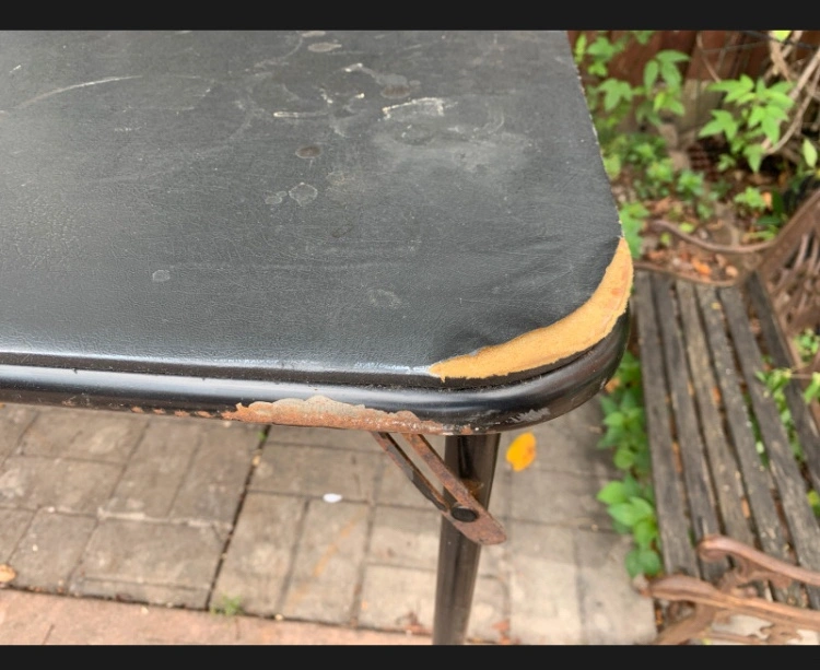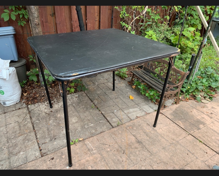 Folding table with metal frame. Table top has a vinyl surface and measures approximately 34 inches by 34 inches. The table folds for easy storage. Great for picnics or camping. Has some wear and tear, but still solid.