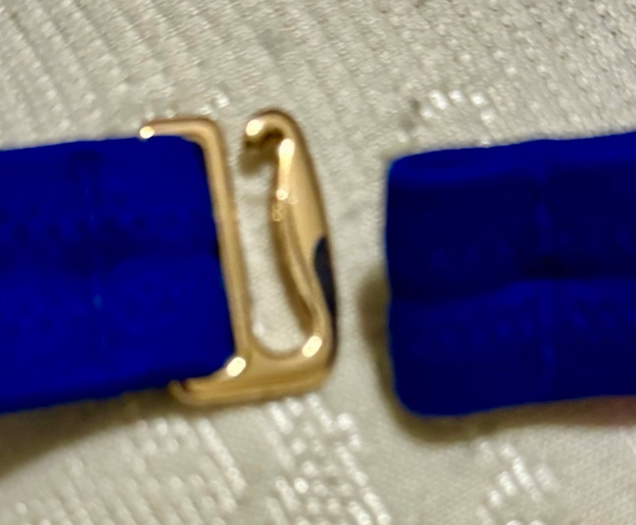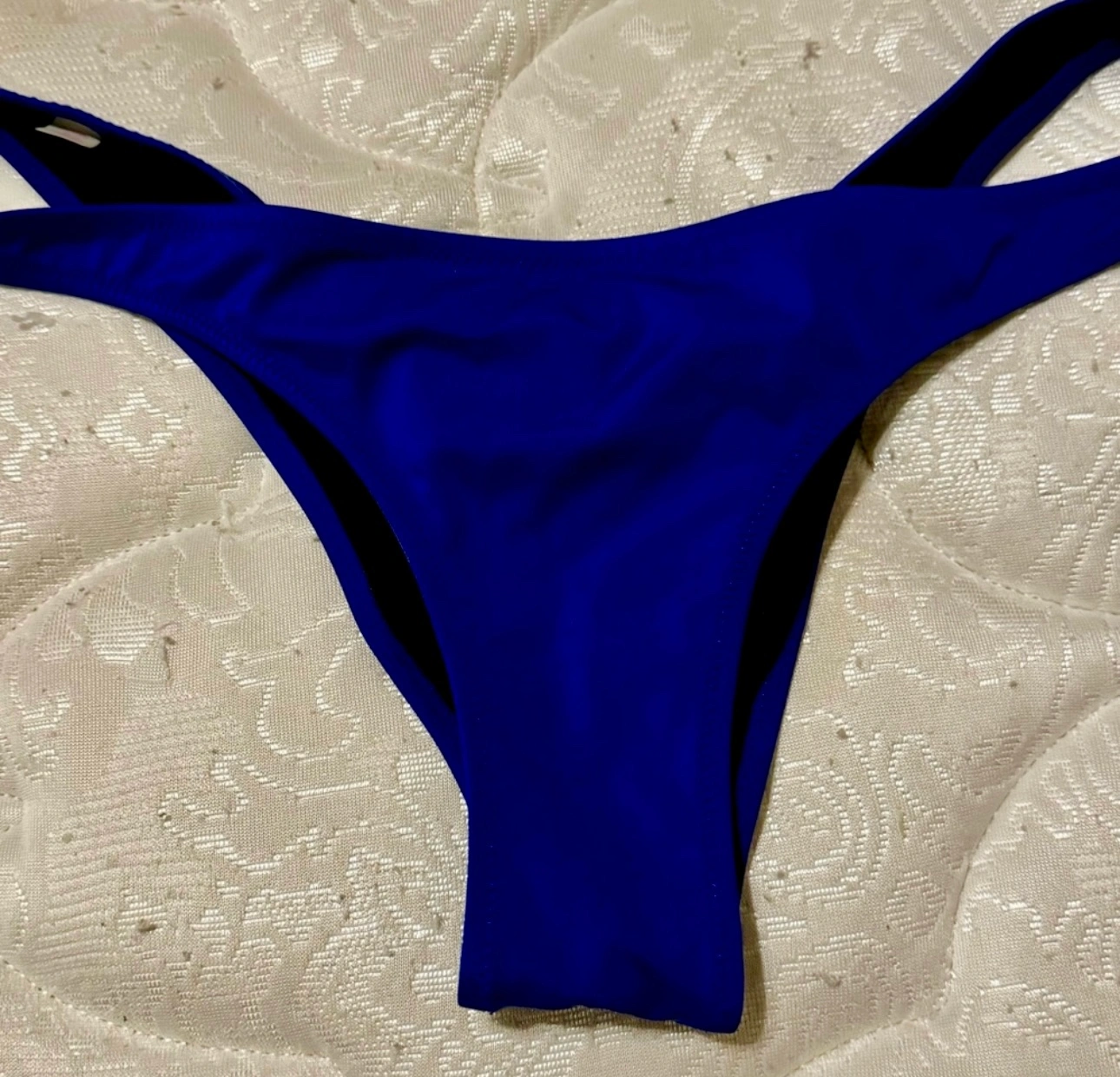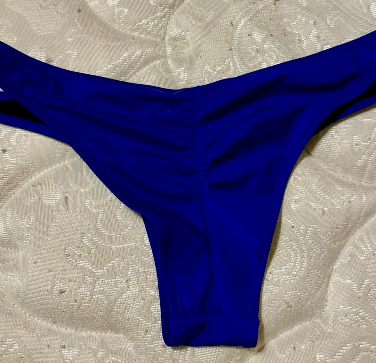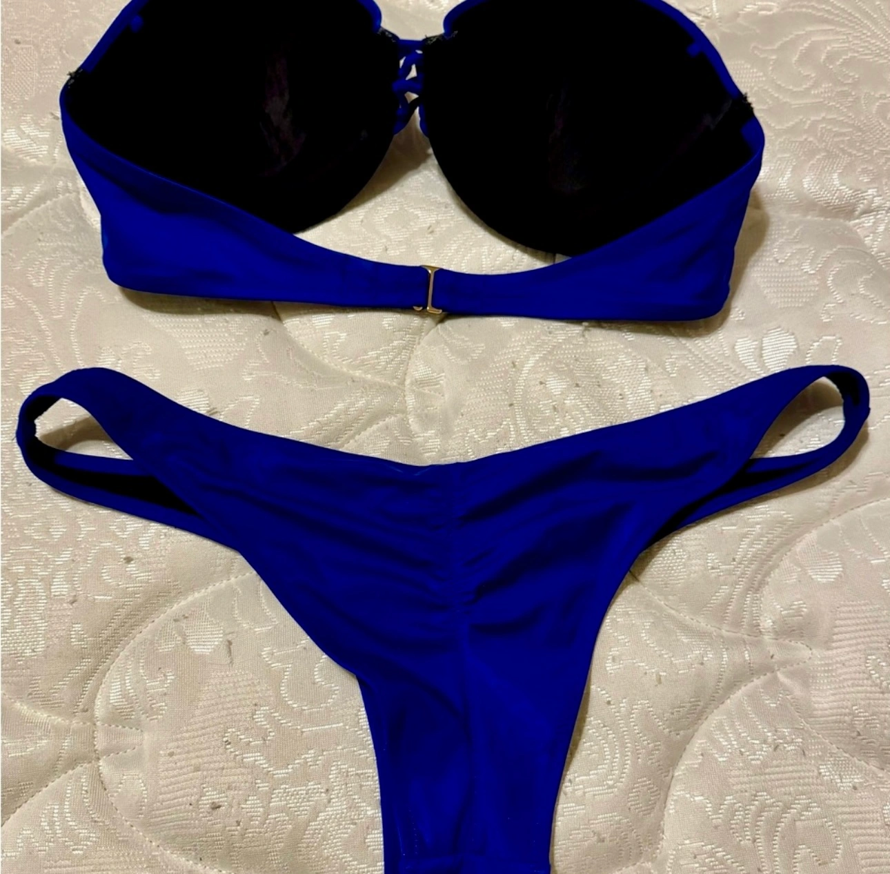 This is a two-piece bikini in the color blue. The top is a bandeau style with a clasp in the back. The bottom is a cheeky style,