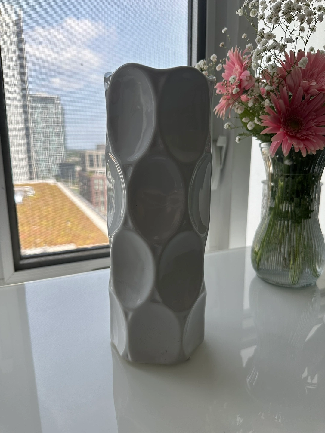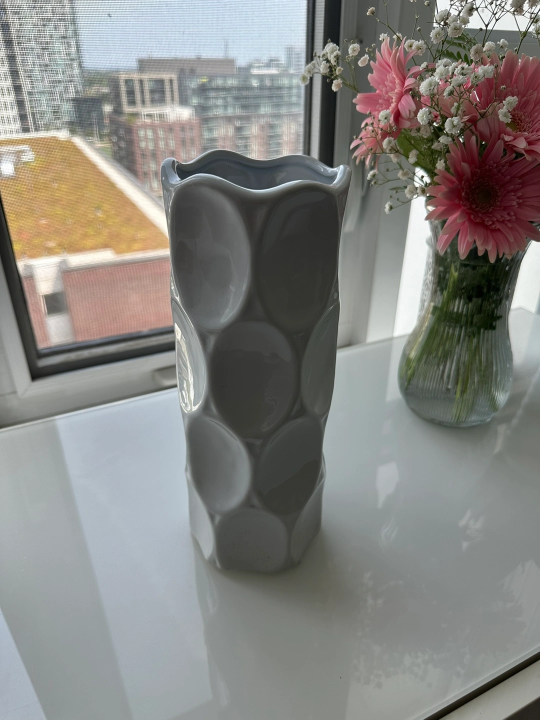 A beautiful grey ceramic vase with a unique design. It would look great in any home!