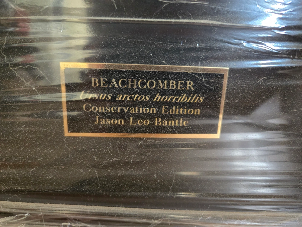 Framed print of a grizzly bear by Jason Leo Bantle. The print is titled "Beachcomber Ursus arctos horribilis Conservation Edition". It is in a black frame with a glass front.
