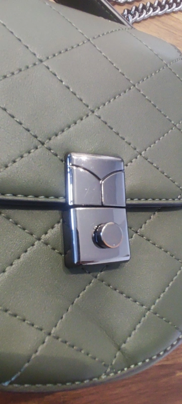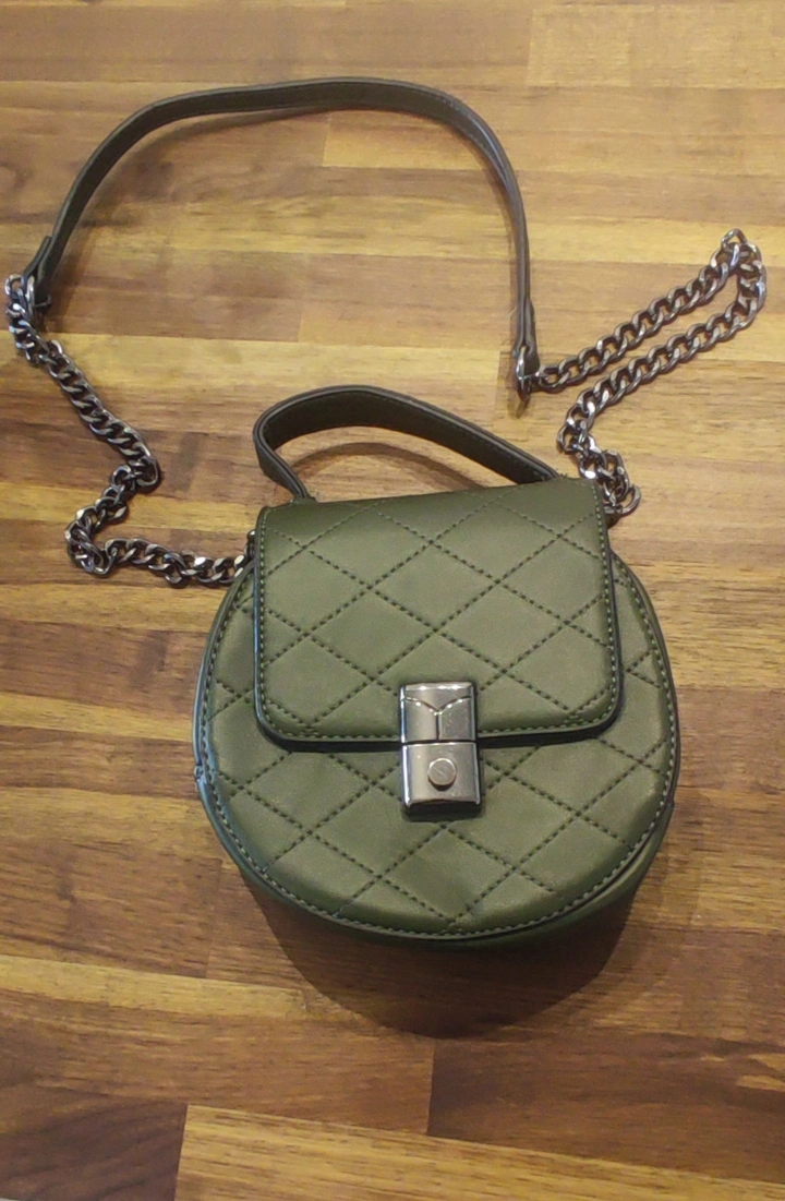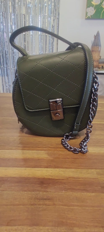 304Small green (Olive color) quilted round bag with a chain strap and a top flap with a magnetic clasp. The bag has a zippered closure. It can be worn as a shoulder bag or a crossbody bag.