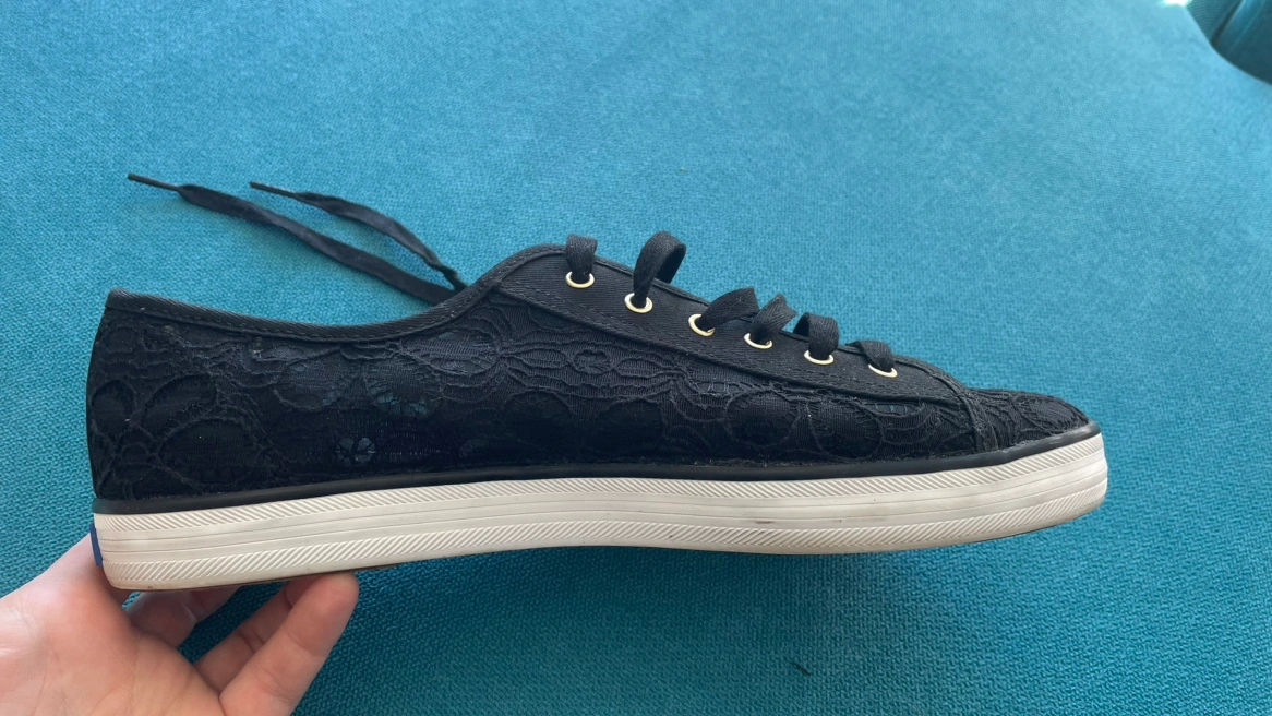 82Black lace-up sneakers with gold accents and a butterfly design.