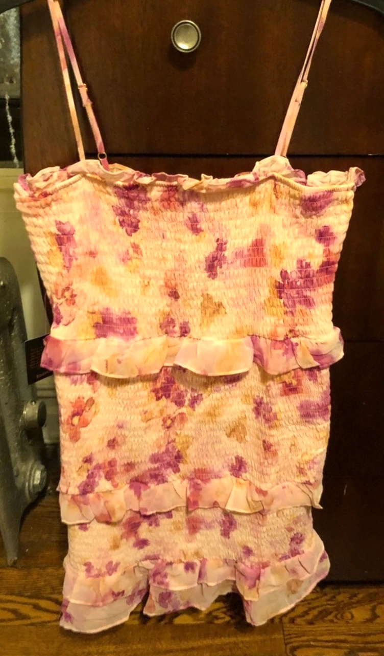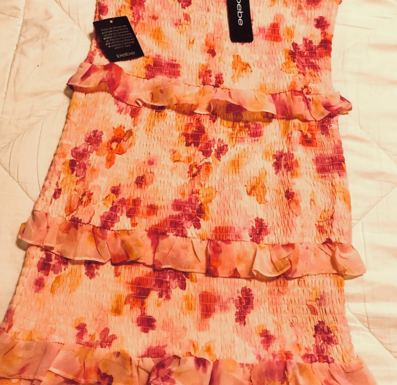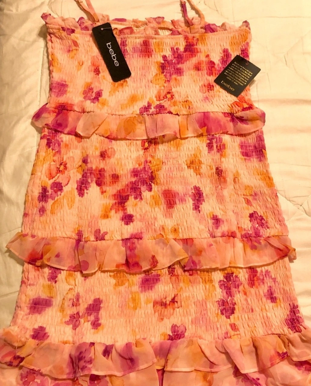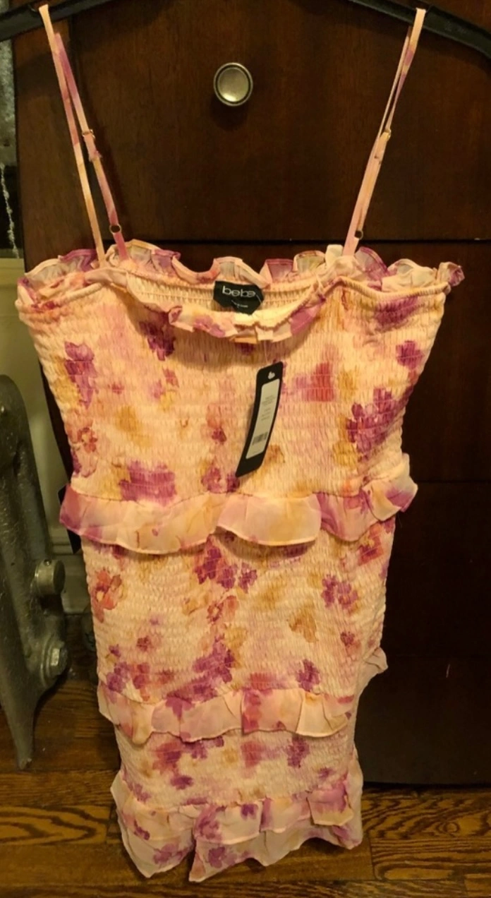 Bebe floral mini dress with adjustable straps and a tiered ruffle hem.