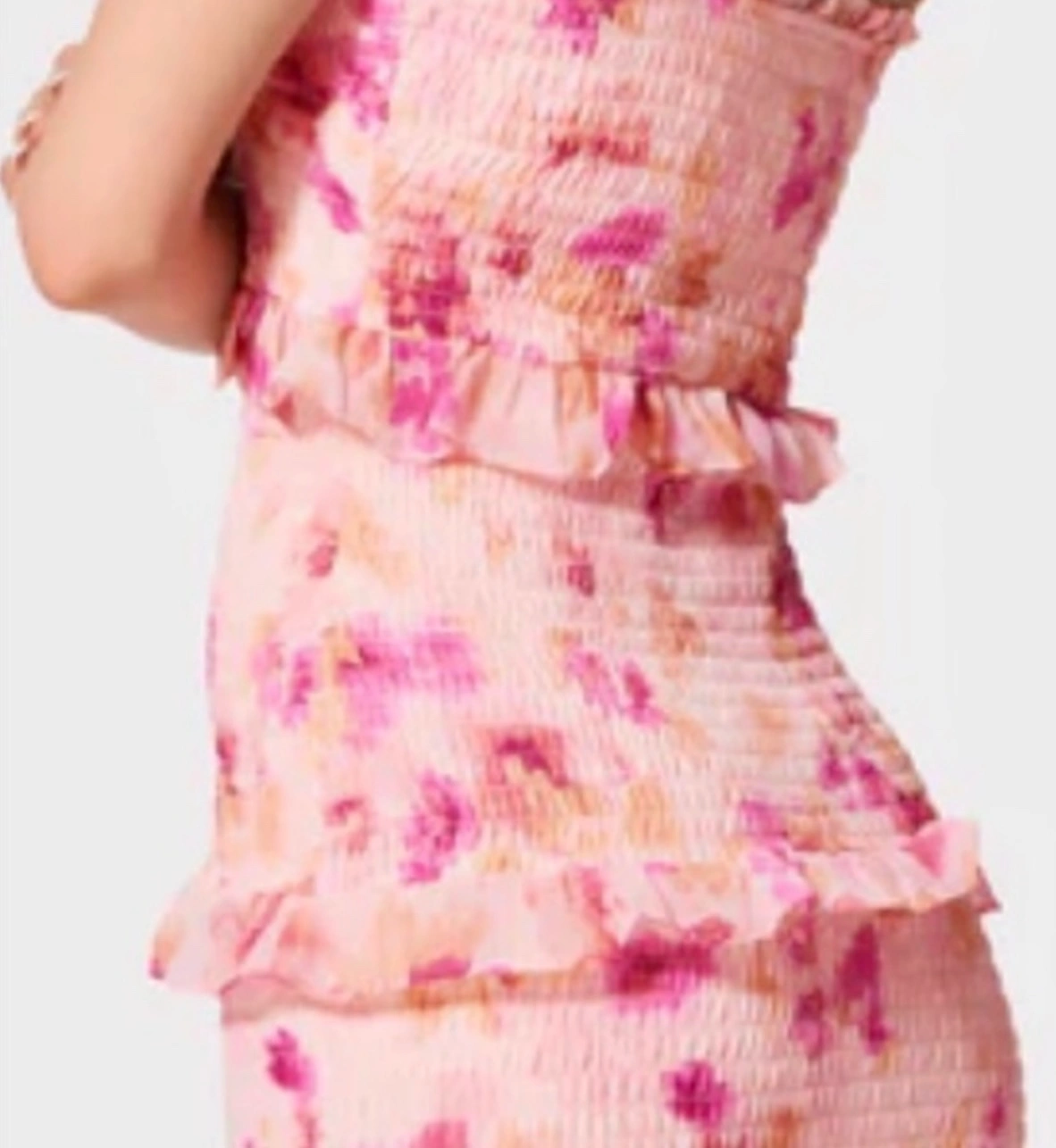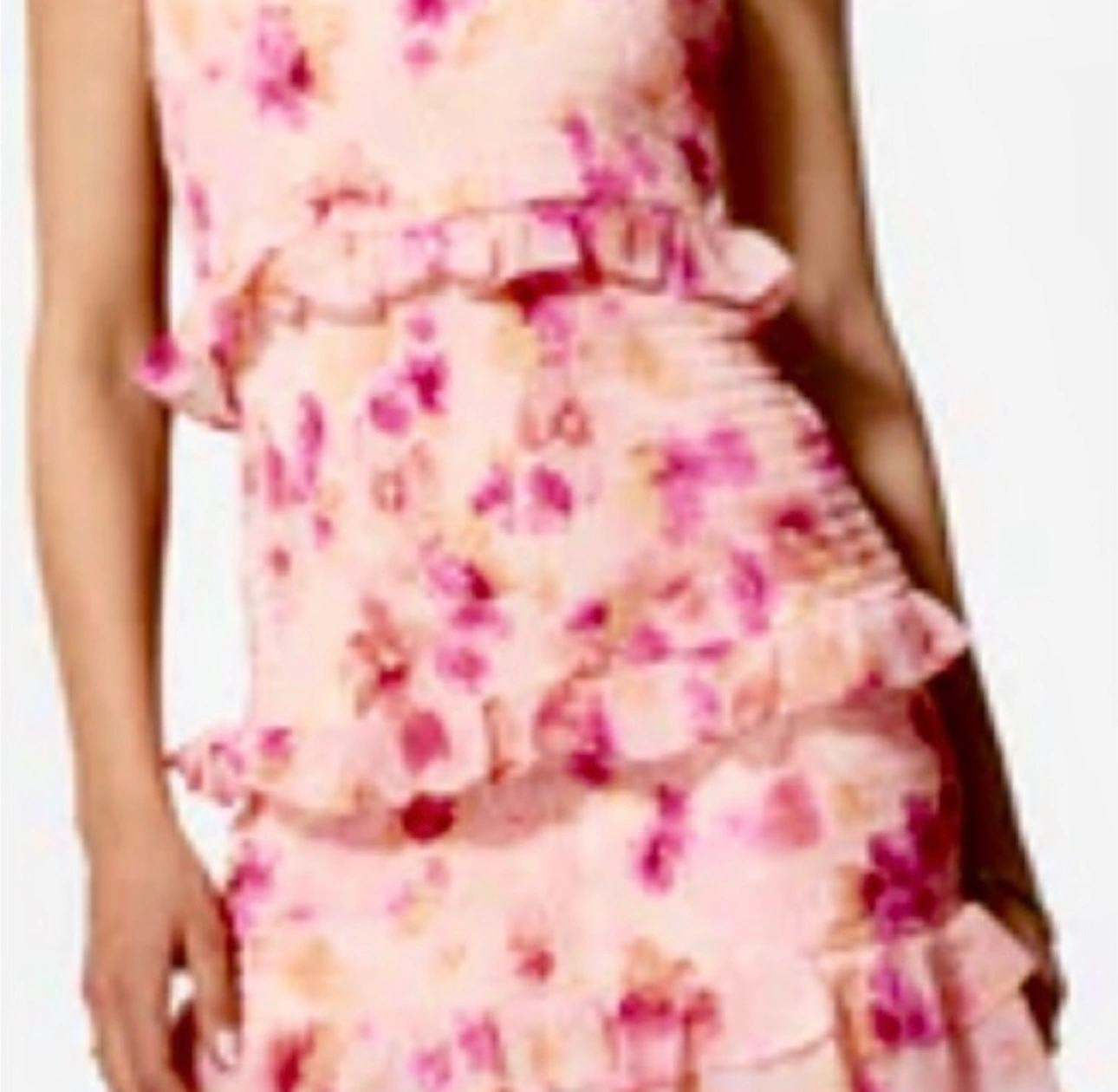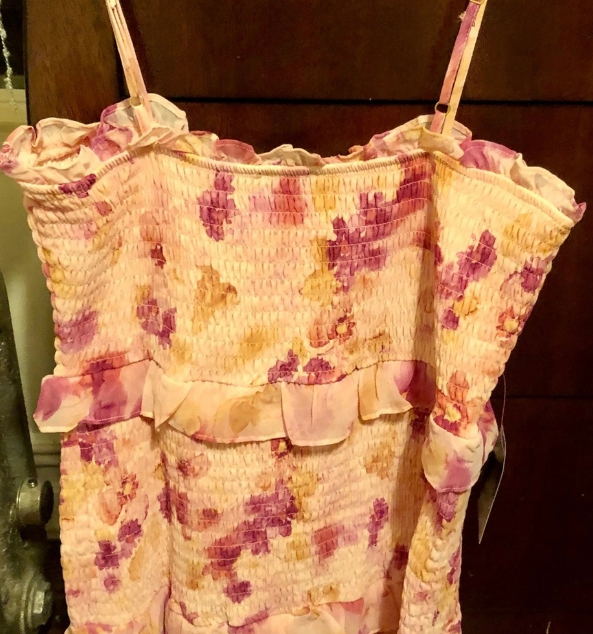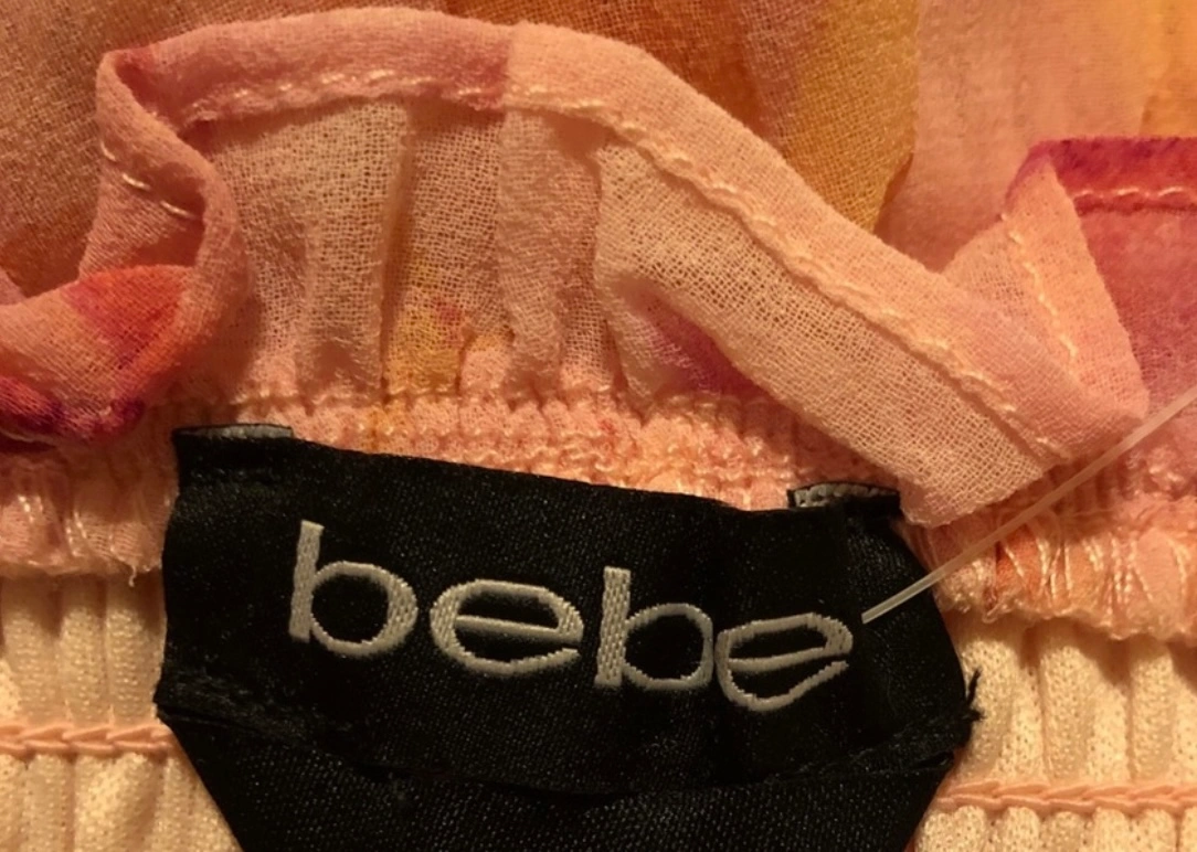 Bebe floral mini dress with adjustable straps and a tiered ruffle hem.