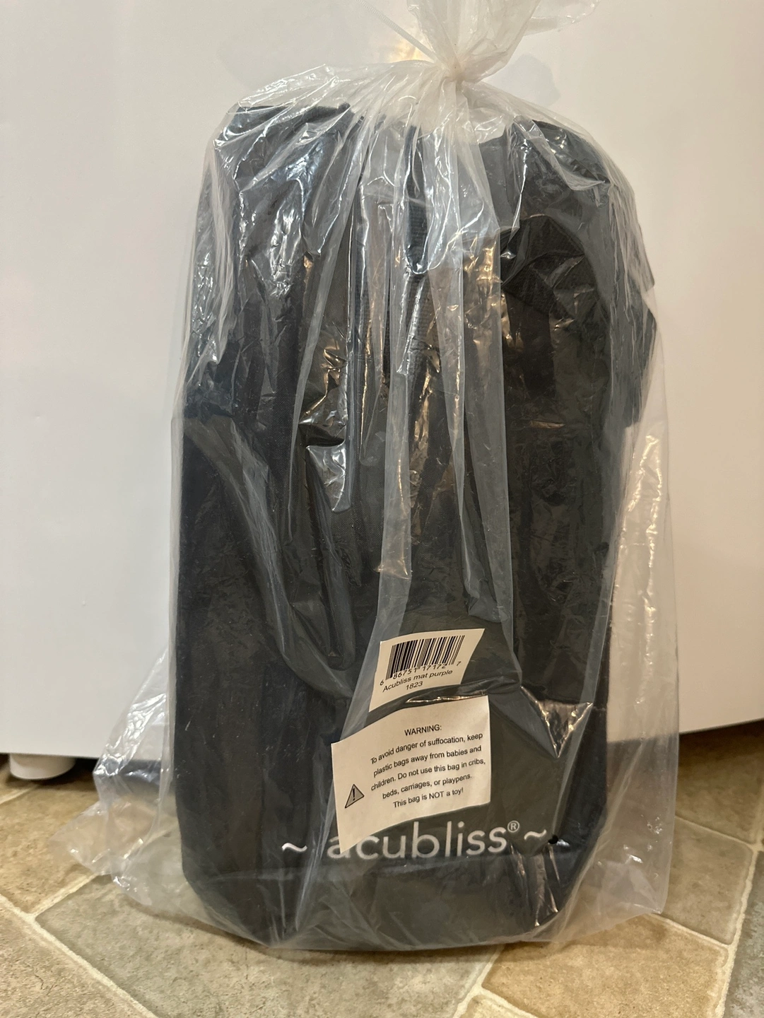 Acupressure mat with 8,358 nails. Great for getting the benefits of acupressure treatment at home. I usually lie on mine for 15-20 minutes a day for stress and pain relief. It’s been a real game changer for me. Mat is purple in color and comes with a carrying bag. Brand new and unopened. Selling as I already have the mat in another color.