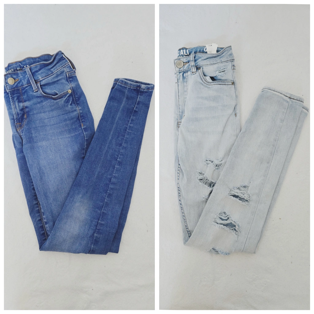 1: $5 Old Navy dark blue skinny jeans. Thick denim material. Fits size 0 Best.