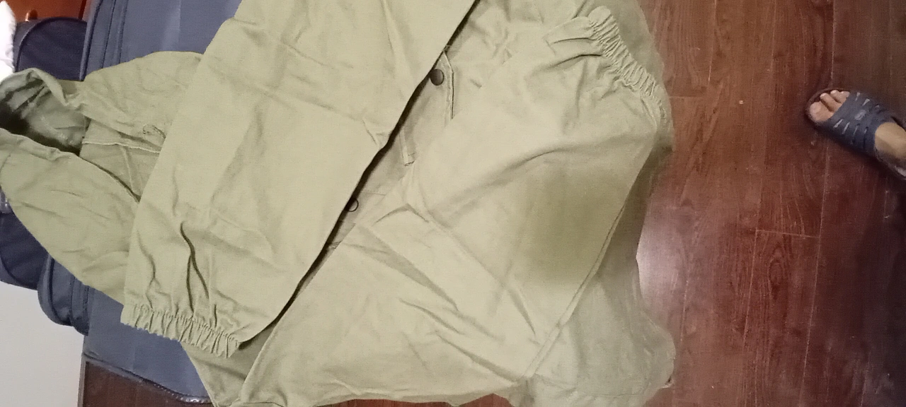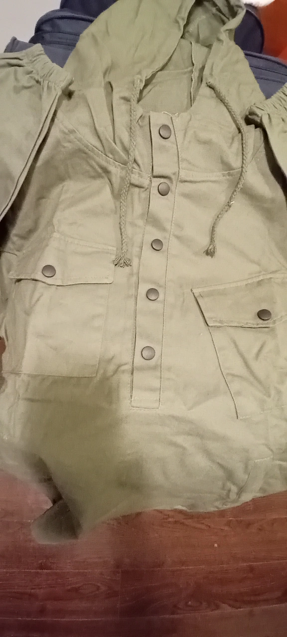A green hooded top with button closures and pockets. It has long sleeves with elastic around the cuffs. The drawstring on the hood is also green. It's a cute and comfy casual top!