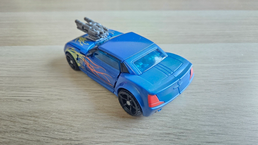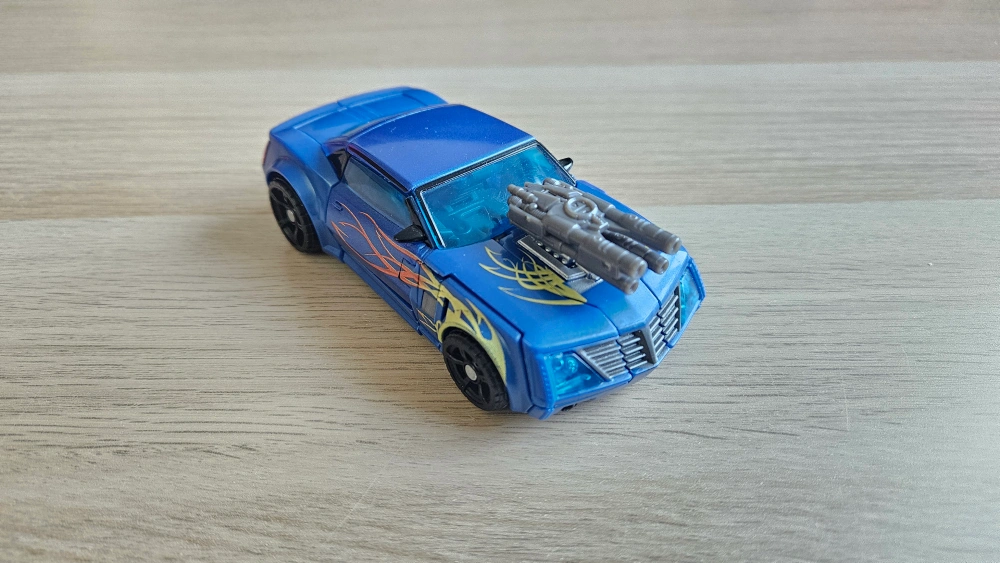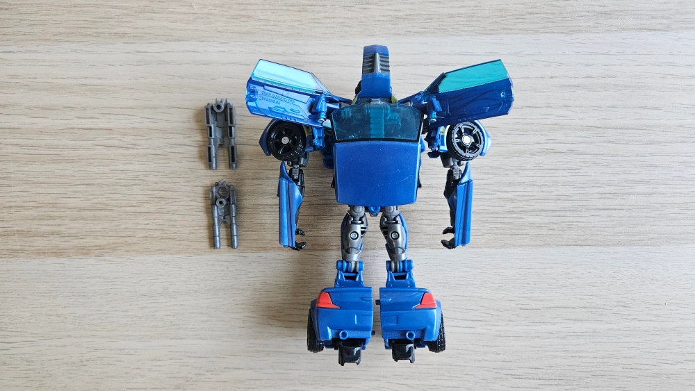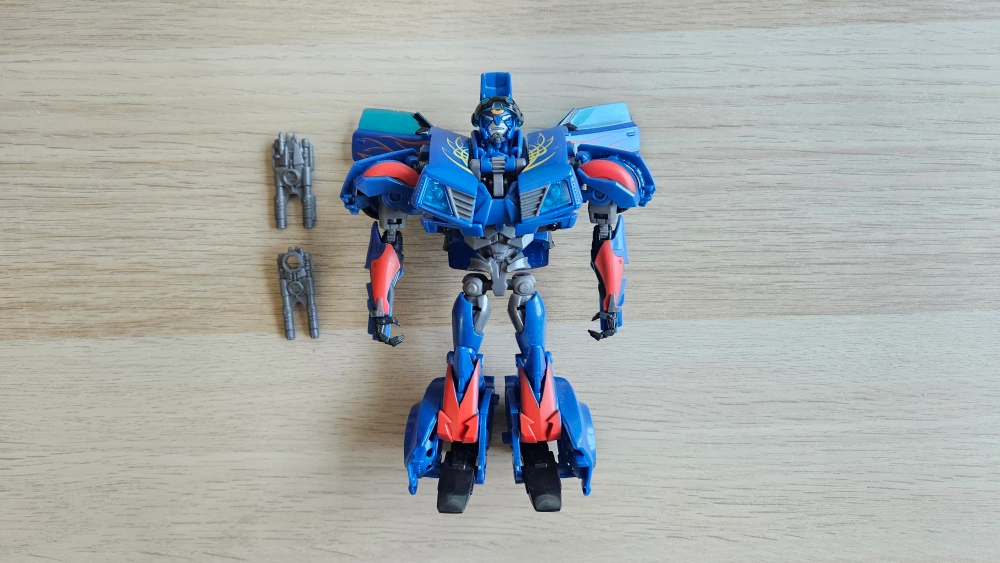 The figure is able to transform from robot to vehicle mode and back again. The figure comes with a pair of accessories.