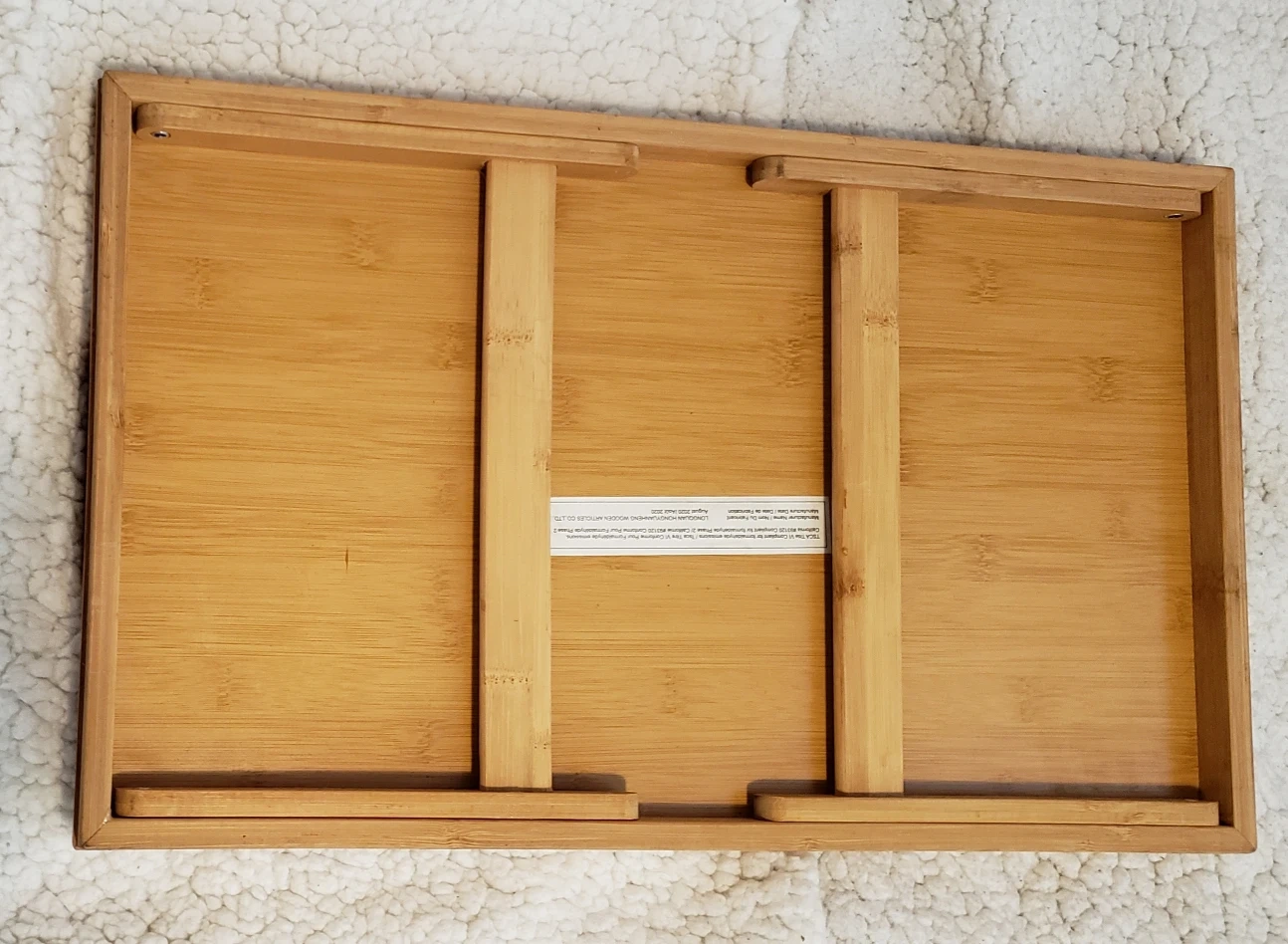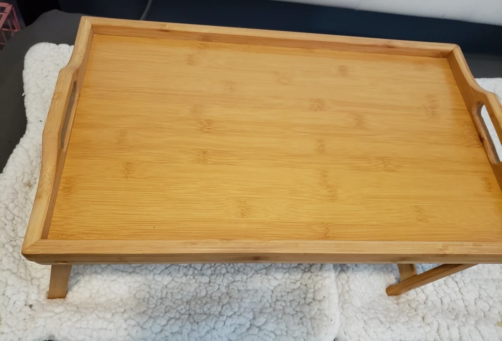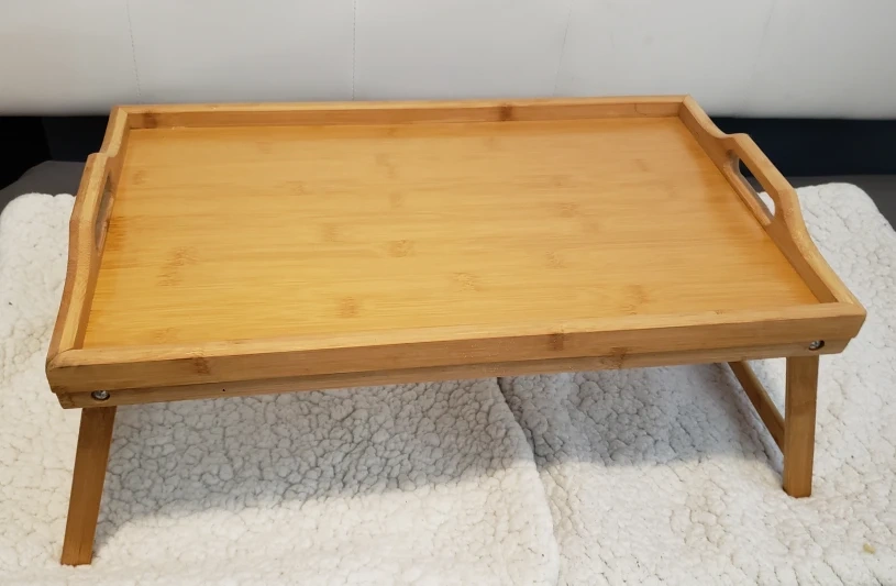 A bamboo lap desk with two handles and folding legs. Perfect for working or eating in bed or on the couch.