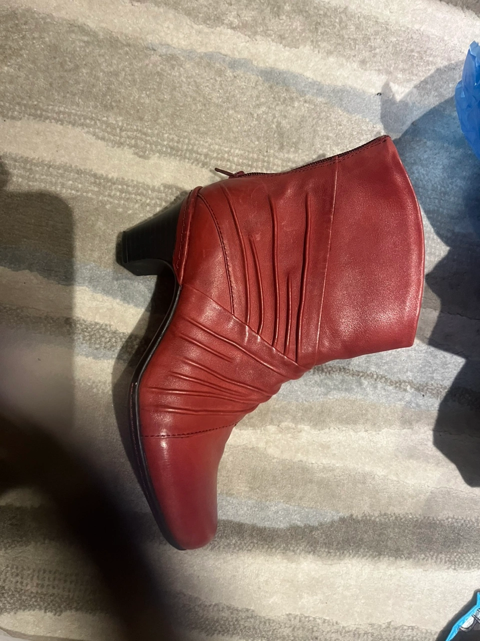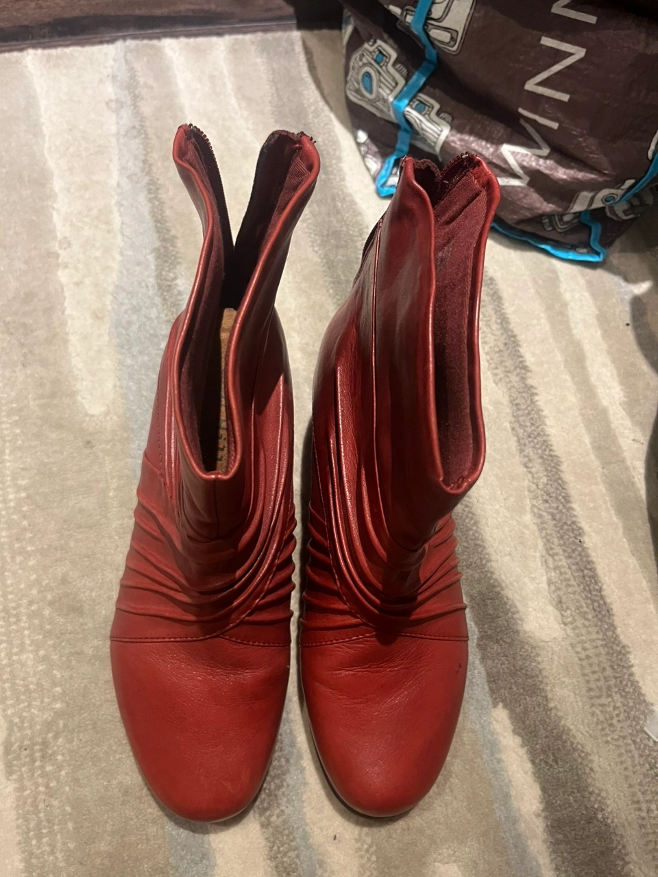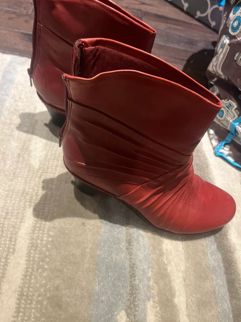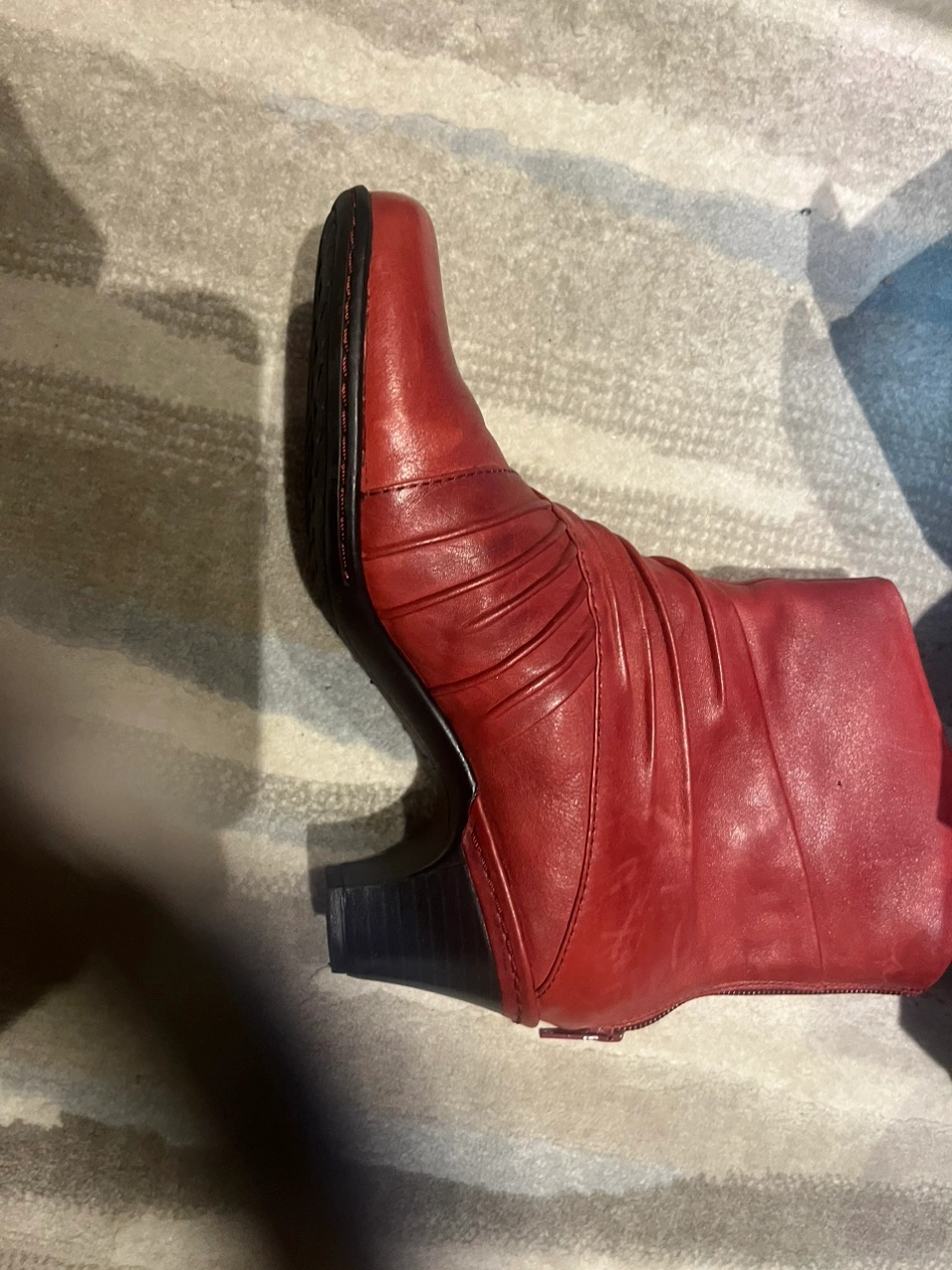 These are a pair of red leather ankle boots. They have a zipper on the inside of each boot. They have a low heel and a round toe. These were not worn at all outside. They’re in great condition! Purchased at walking on a cloud. Make me an offer. Cash only please