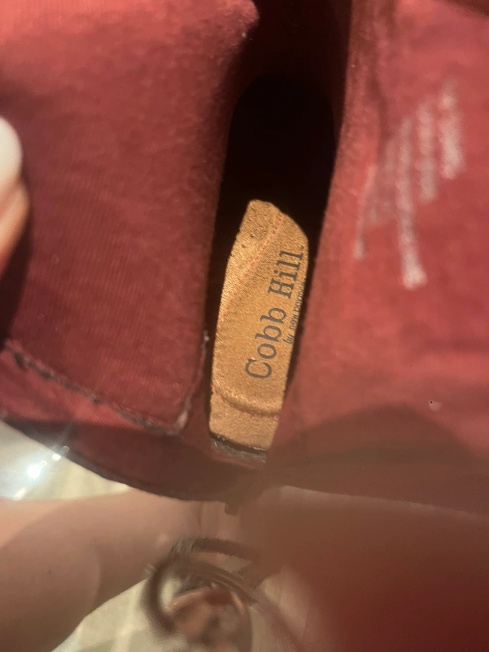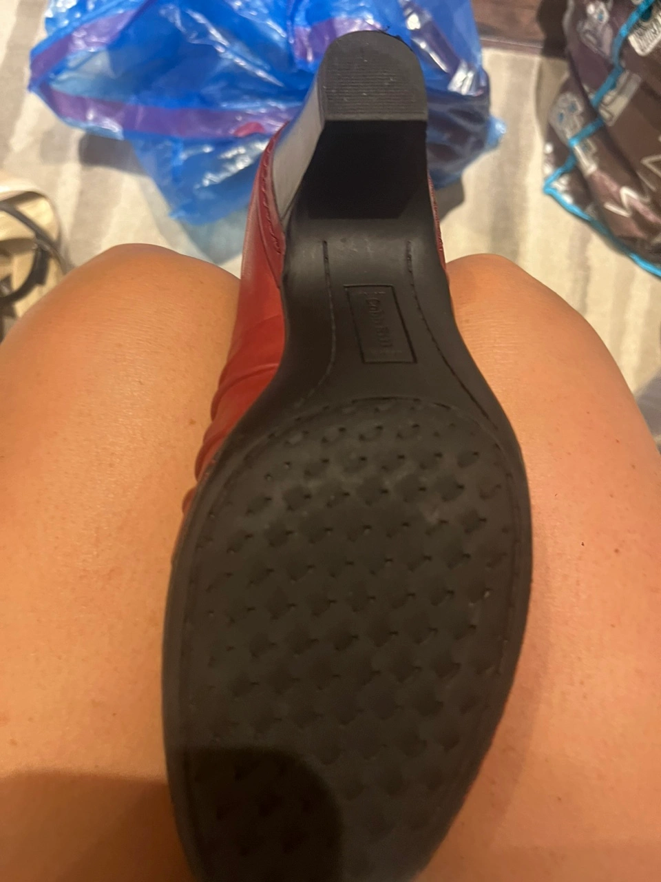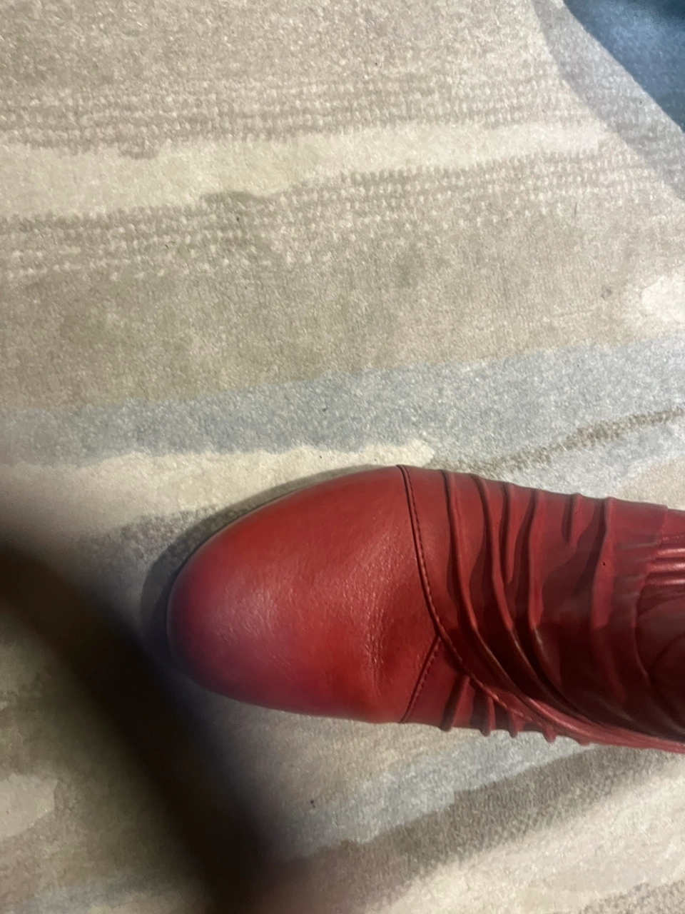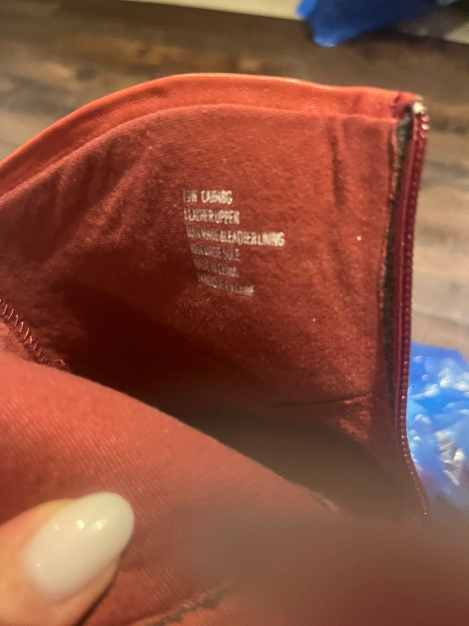 These are a pair of red leather ankle boots. They have a zipper on the inside of each boot. They have a low heel and a round toe. These were not worn at all outside. They’re in great condition! Purchased at walking on a cloud. Make me an offer. Cash only please