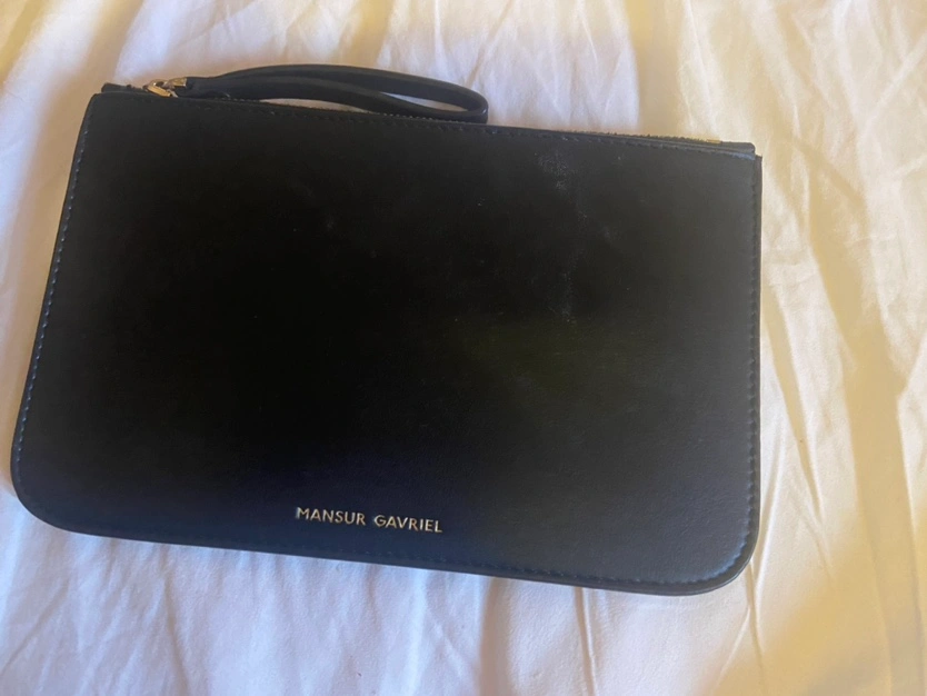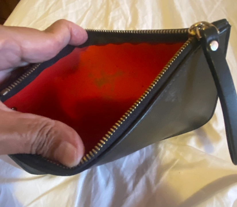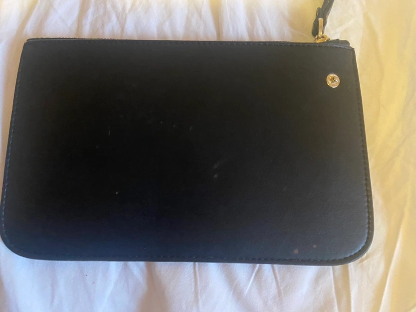 Black leather clutch with gold zipper and hardware. Just the pouch . Has some minor wear as shown in photos . No rips or tears anywhere . Beautiful