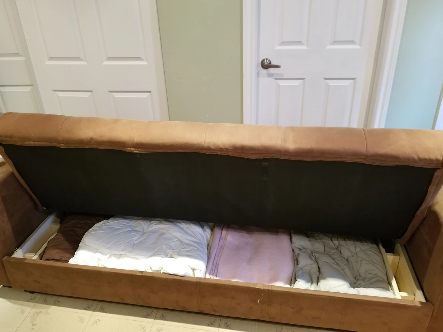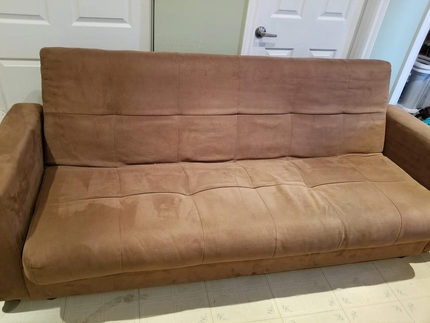 Gently used couch (with storage) that folds out into single bed in seconds. Dimensions as a couch are 34" high, 86" long (with arms), 36" deep. As a bed 16" high, 74" without arms (they can be lifted off), 45" deep (wide).