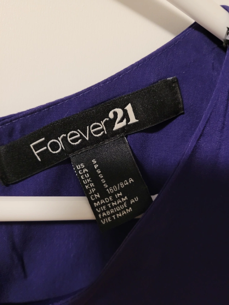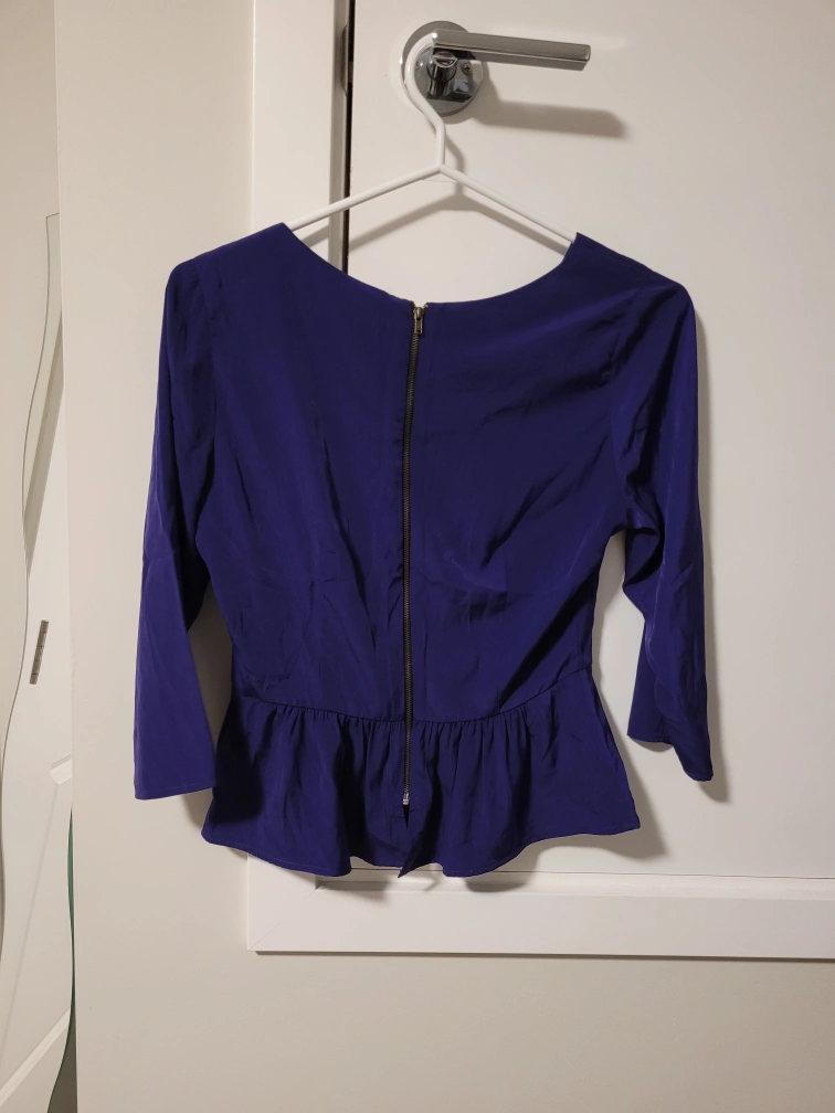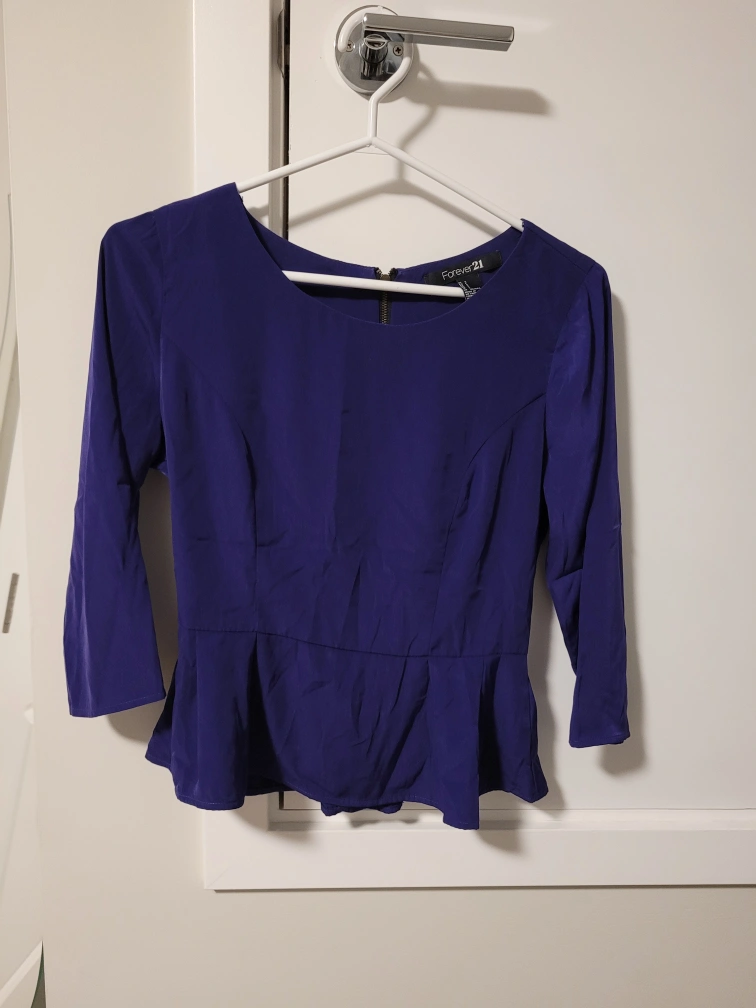 A purple Forever 21 blouse with 3/4 sleeves and a zipper at the back. It has a ruched/gathered design.