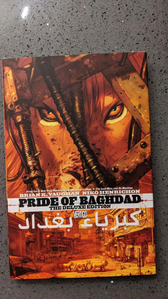 735Pride of Baghdad Deluxe Edition (Vertigo Comics) Hardcover by Brian K. Vaughan "The startlingly original look at life on the streets of Baghdad during the Iraq War inspired by true events arrives in a stunning new softcover edition. In his award-winning work on Y: The Last Man and Ex Machina (one of Entertainment Weekly's 2005 Ten Best Fiction titles), writer Brian K. Vaughan has displayed an understanding of both the cost of survival and the political nuances of the modern world. Now, in this provocative graphic novel, Vaughan examines life on the streets of war-torn Iraq. The experience is made all the more evocative by the lush, spectacular artwork of Niko Henrichon.In the spring of 2003, a pride of lions escaped from the Baghdad Zoo during an American bombing raid. Lost and confused, hungry but finally free, the four lions roamed the decimated streets of Baghdad in a desperate struggle for their lives. In documenting the plight of the lions, Pride of Baghdad raises questions about the true meaning of liberation - can it be given, or is it earned only through self-determination and sacrifice? And in the end, is it truly better to die free than to live life in captivity?"