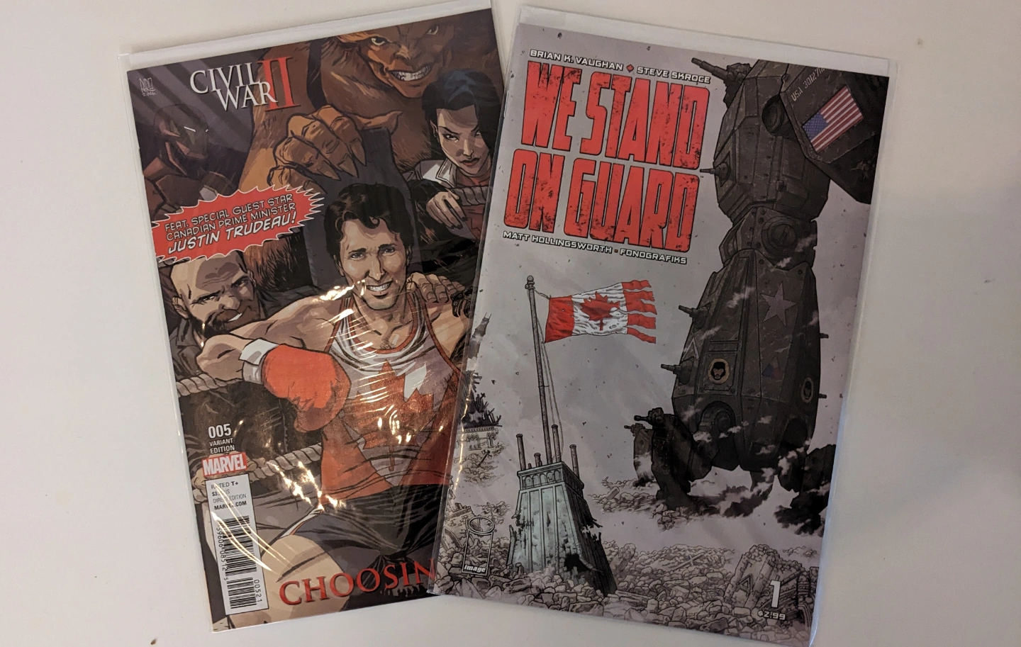 735Canada Comics Set of 2 Comic Books (Civil War II Marvel Comics with Justin Trudeau Variant Cover, and We Stand on Guard Issue #1)