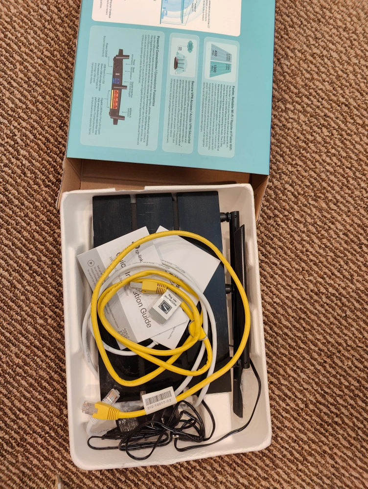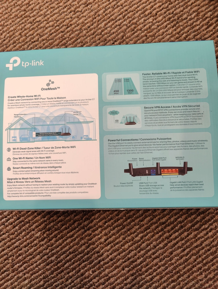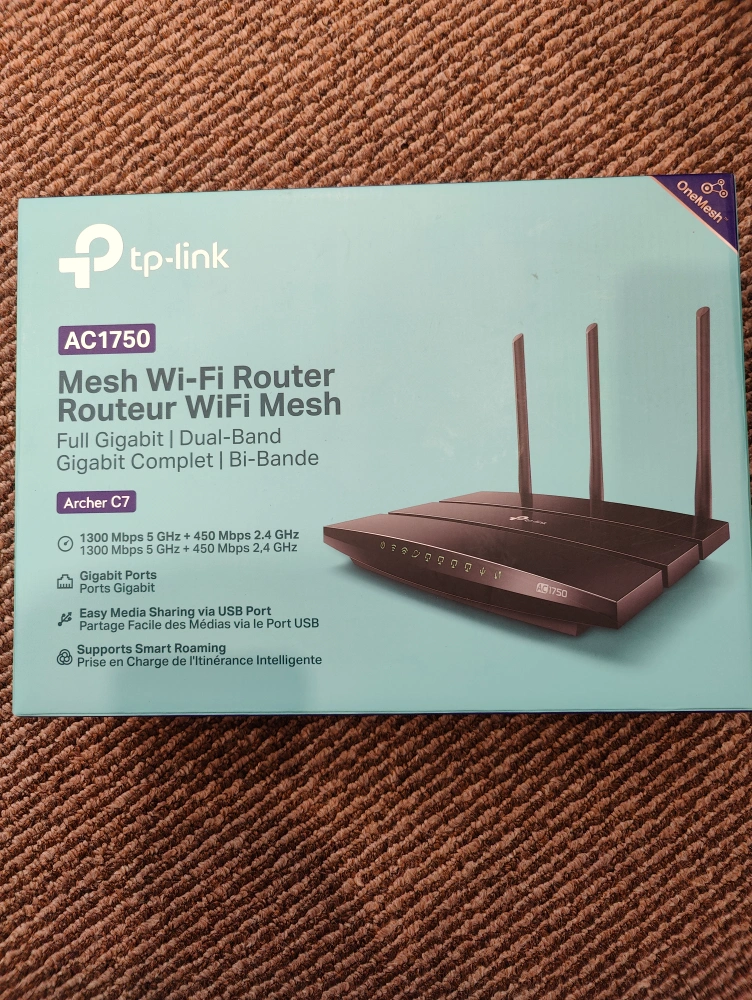 This is a TP-Link Archer C7 AC1750 Wi-Fi router. It comes in its original box and includes a power cable and an Ethernet cable.