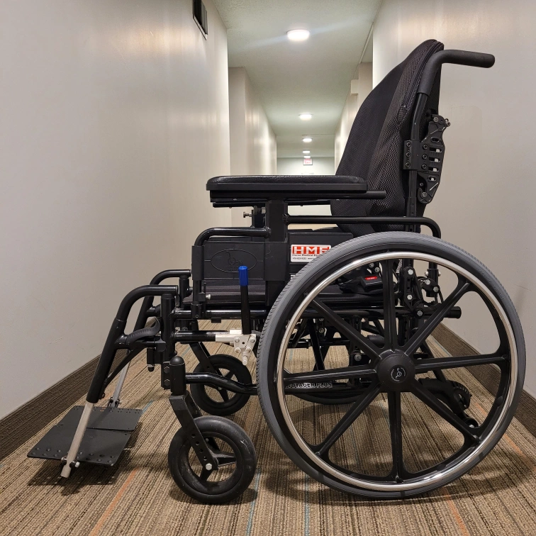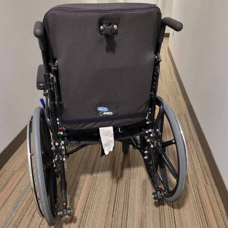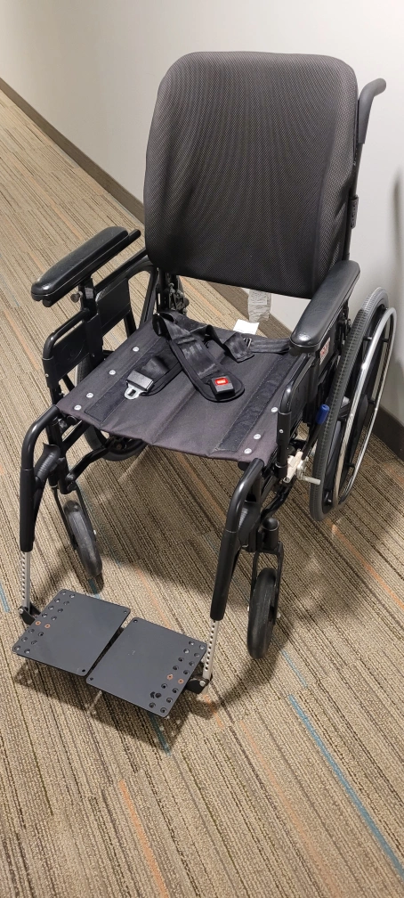 441Voyager Plus Medical wheelchair with a padded seat, black frame, and black wheels. This wheelchair has adjustable and removable footrests. It also includes a seatbelt. folds for easy transport. location is Etobicoke Kipling and Eglinton area.