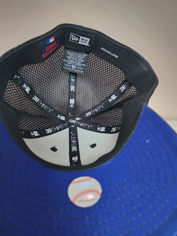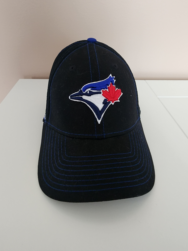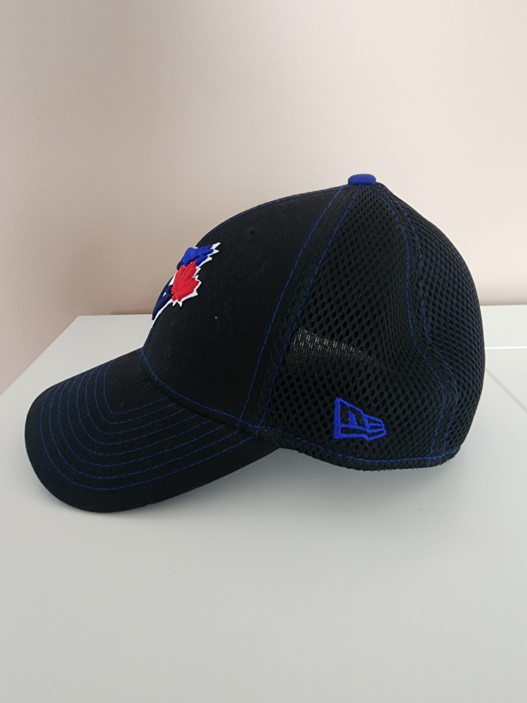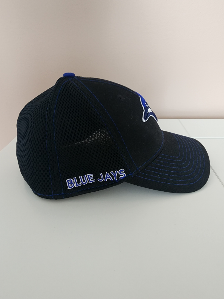 New Era Blue Jays hat with a black crown and a mesh back. The hat features a blue Jays logo on the front and "Blue Jays" embroidered on the side. Brand new, never worn. Unisex size medium-large. From smoke-free & pet-free house. Cash & pick-up only (meet at Pimisi East station)