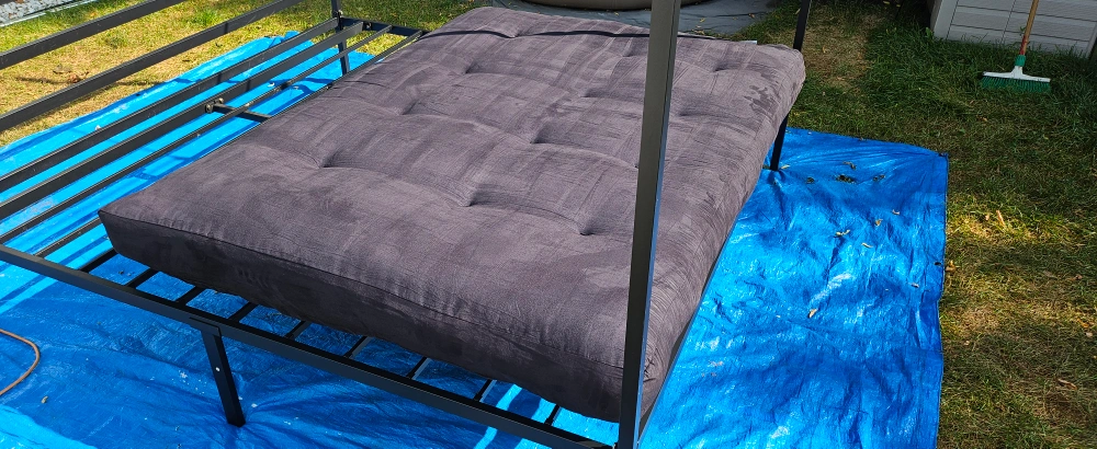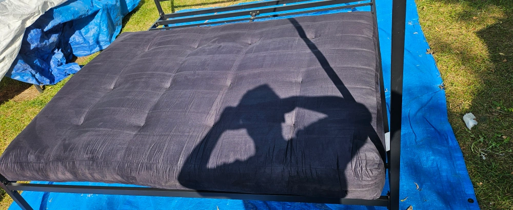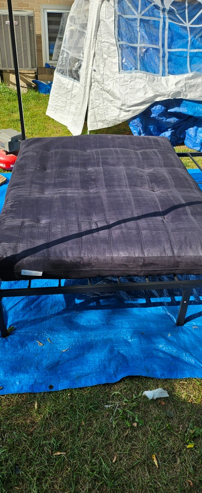 A full-size futon mattress. The futon is a black fabric mattress. It is in a new condition and ready to be used.