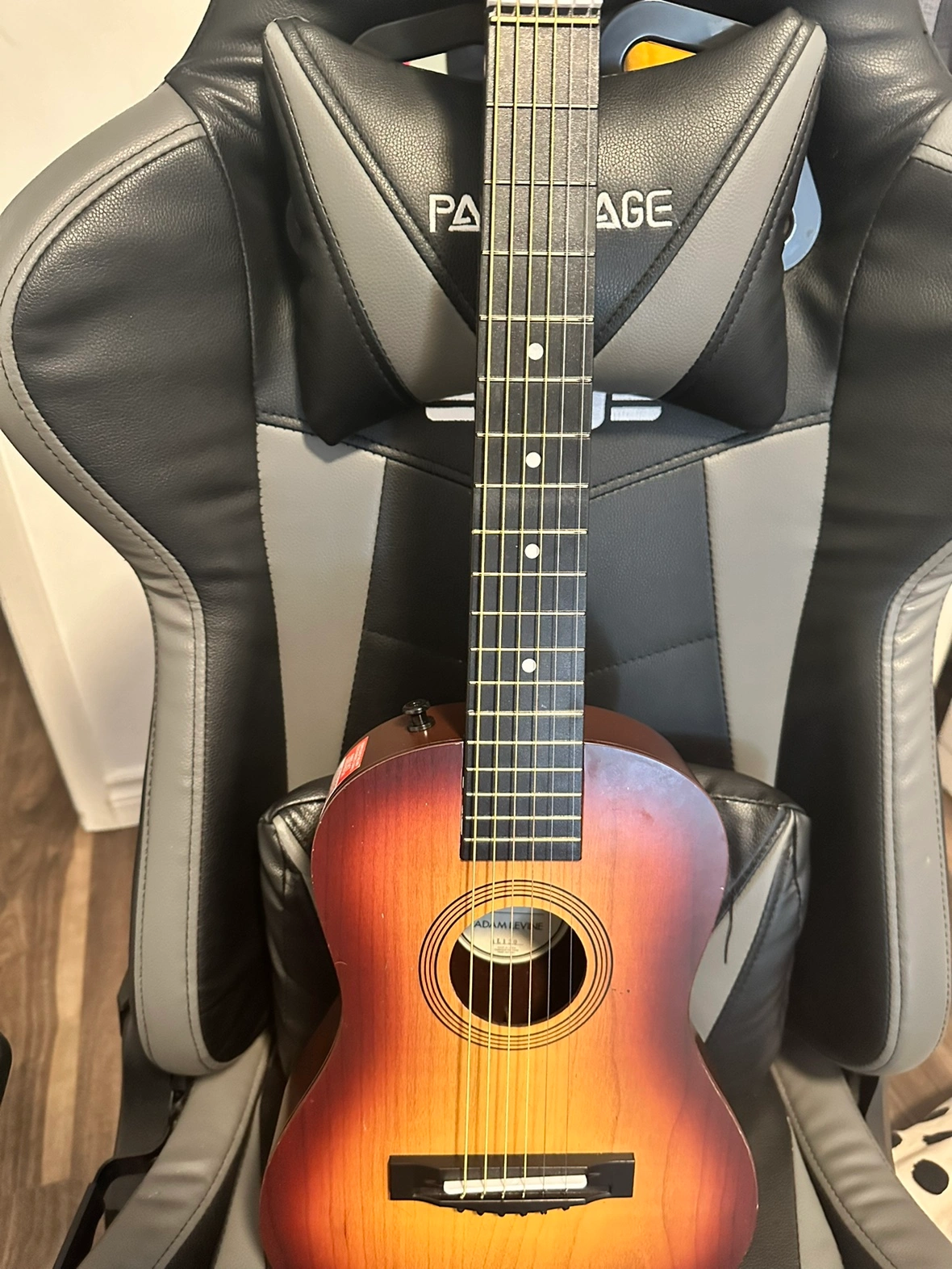 A small acoustic guitar. It has a sunburst finish. The brand is not visible. It comes with a black pickguard. There is a round sound hole with a brand name inside. It has a dark coloured neck. There are six strings on the guitar. There is a tuning peg on the top of the guitar headstock. There is a black knob on the guitar body, which may be for volume control. It has chrome tuning pegs. The guitar body is slightly rounded.