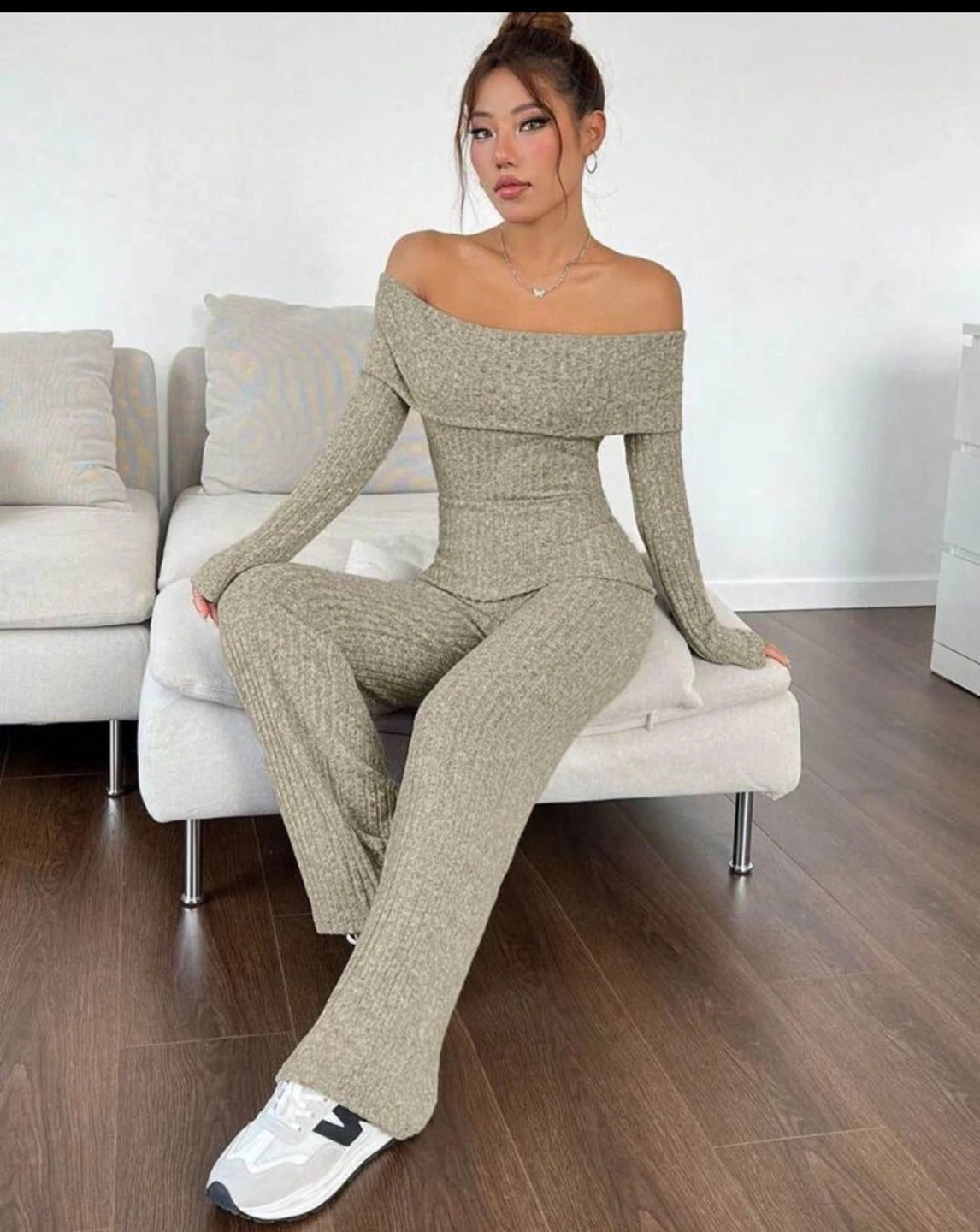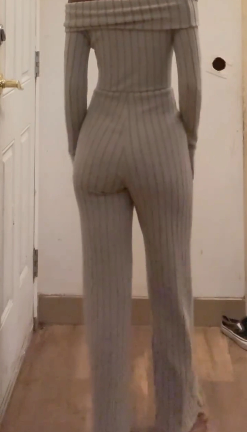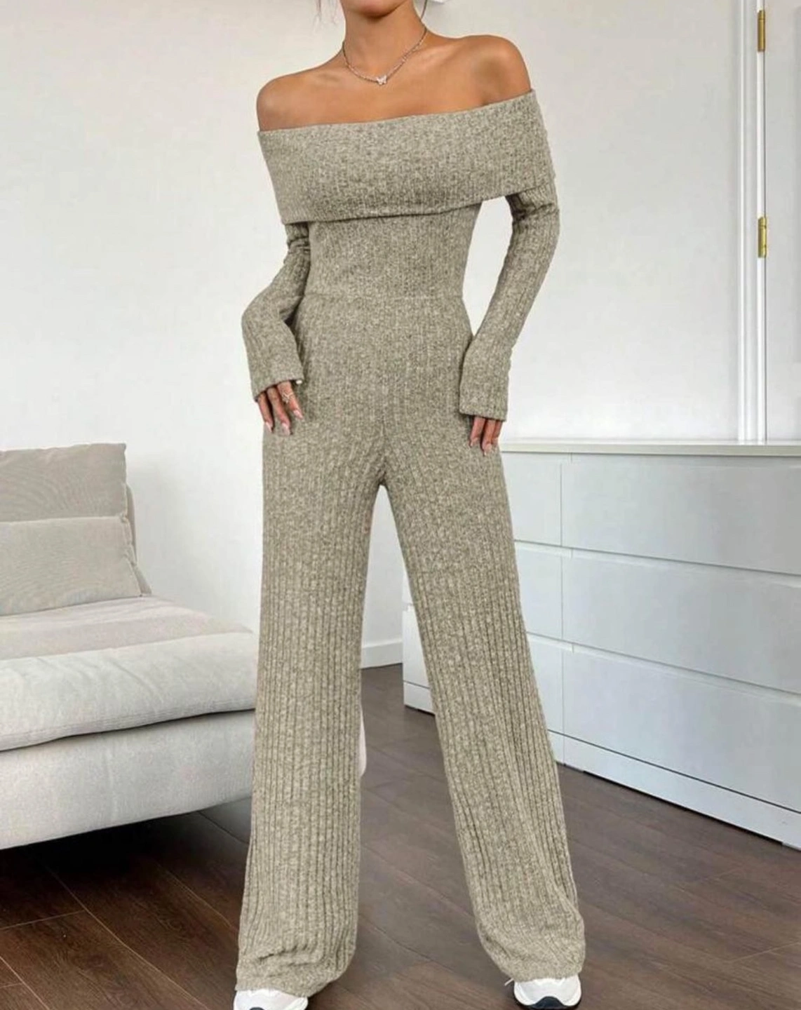 A soft, stretchy and comfortable jumpsuit. Great for a casual, yet stylish look. It features an off-the-shoulder neckline and long sleeves. The ribbed knit fabric is lightweight and breathable, making it perfect for warmer weather. This jumpsuit is a great choice for any occasion. It can be dressed up or down, depending on your style.