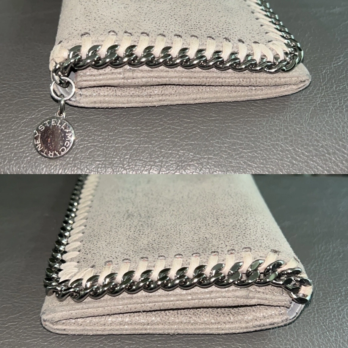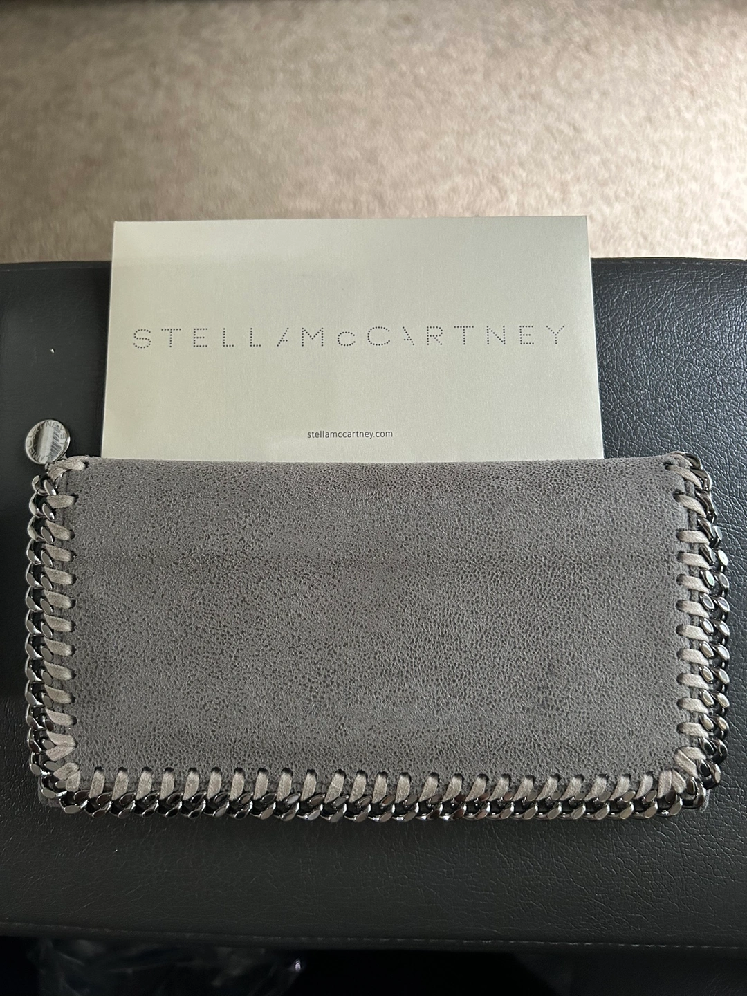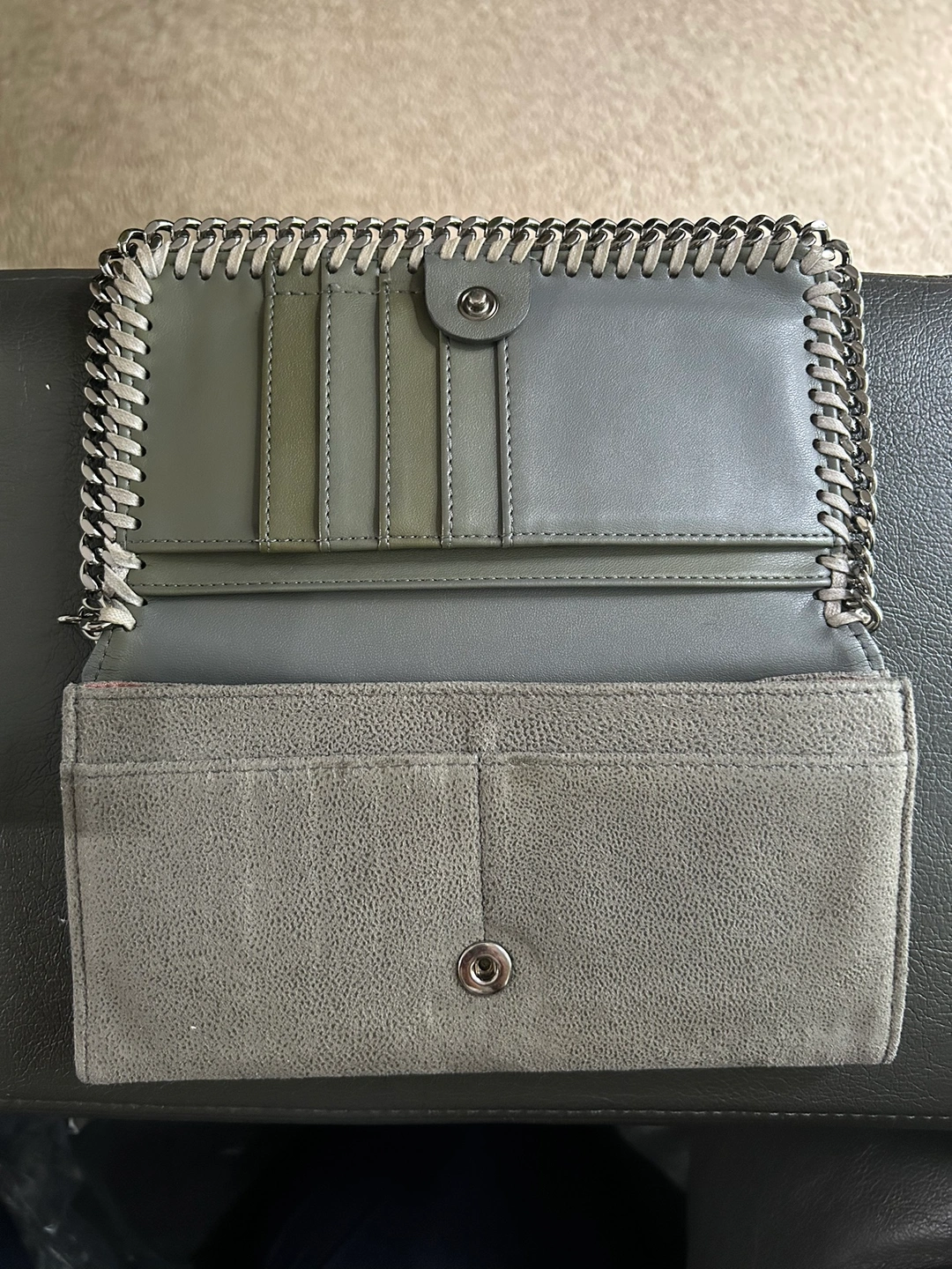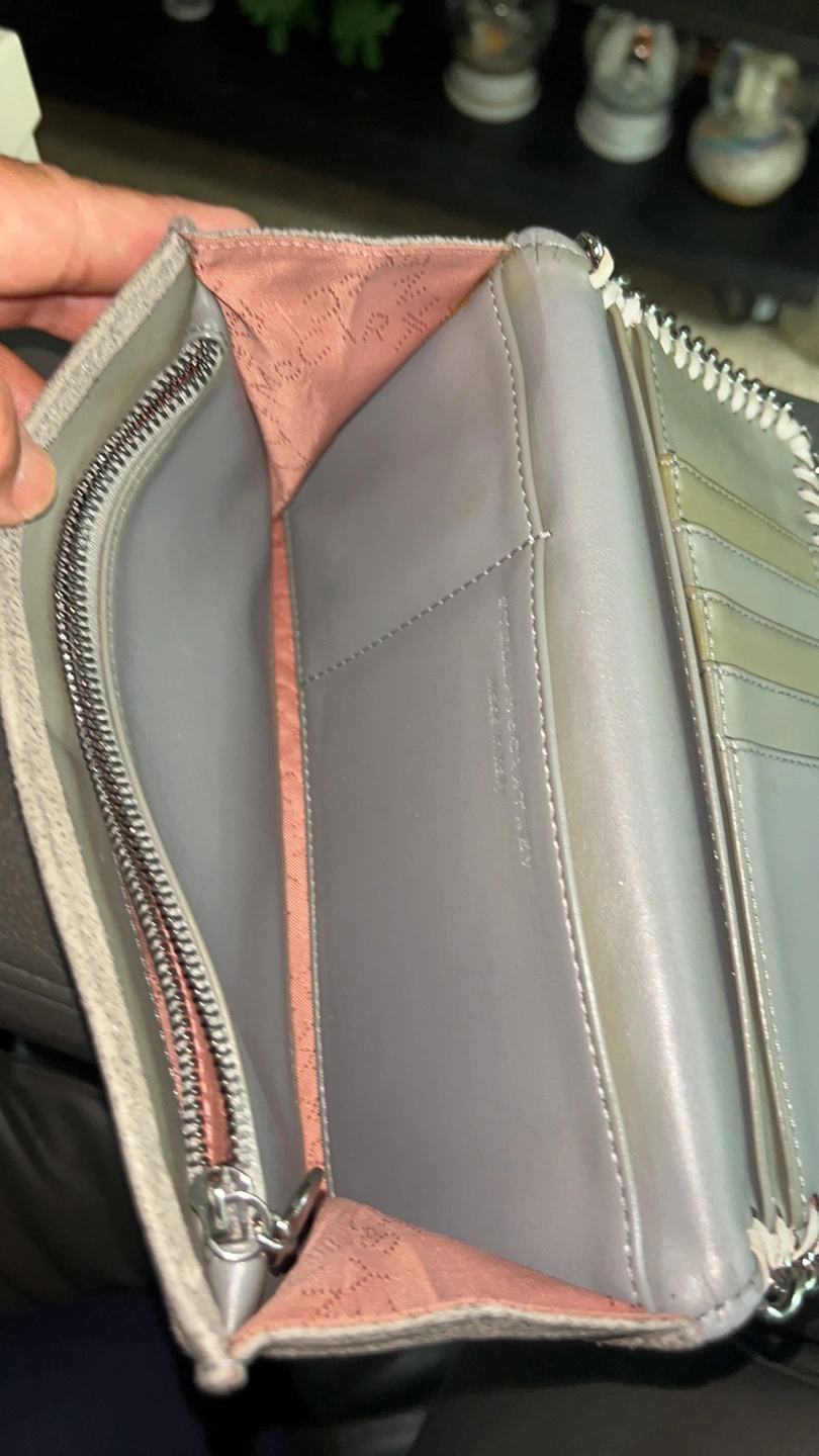 A grey Stella McCartney wallet with a chain around the outside. It has a flap closure and a snap button. Inside, it has five card slots, a zippered compartment, and a large open pocket.