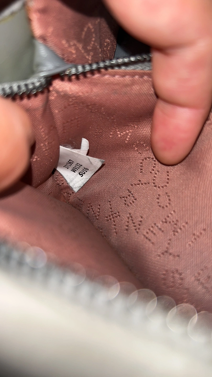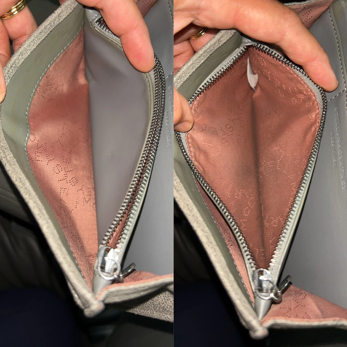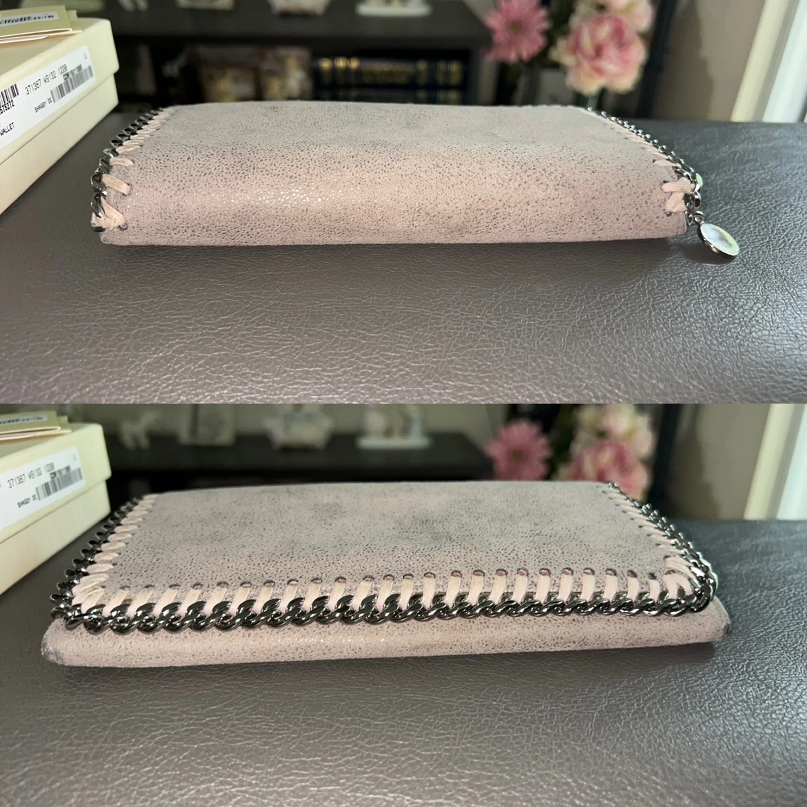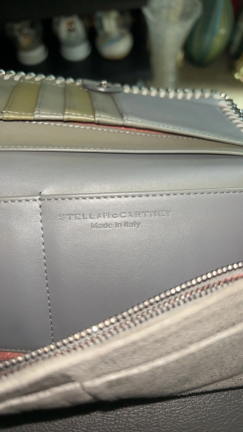 A grey Stella McCartney wallet with a chain around the outside. It has a flap closure and a snap button. Inside, it has five card slots, a zippered compartment, and a large open pocket.