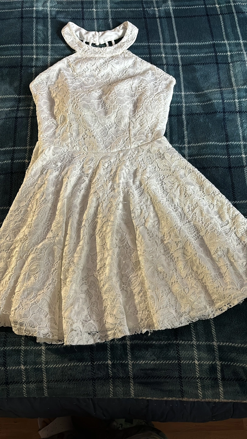 Beautiful white lace dress with a halter neckline. It is a great option for a special occasion or even just a night out. It is in excellent condition and would make a great addition to your wardrobe.