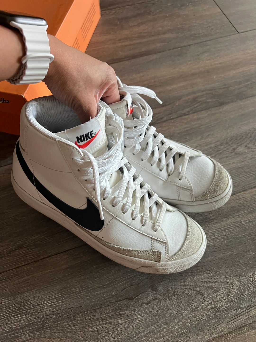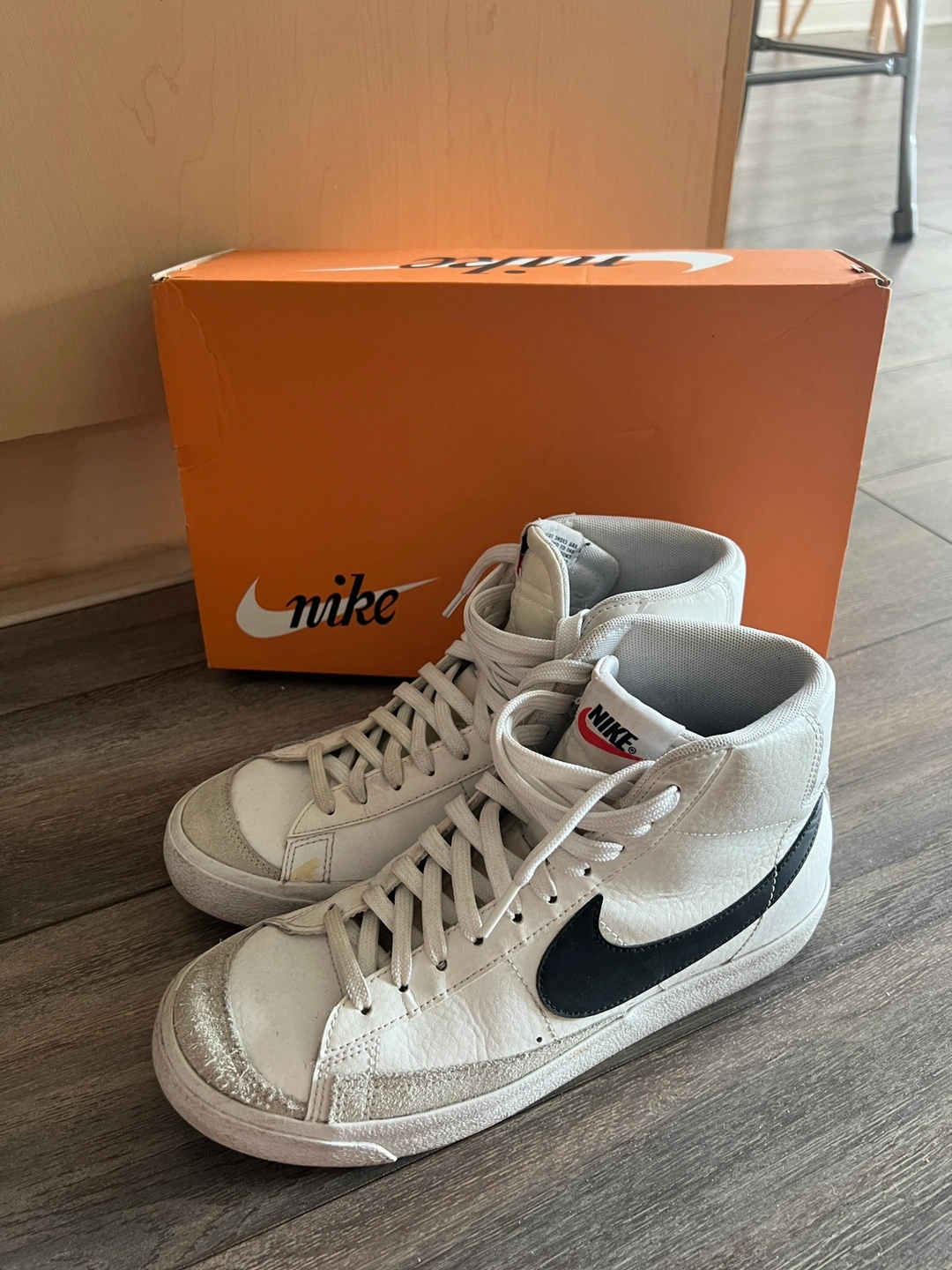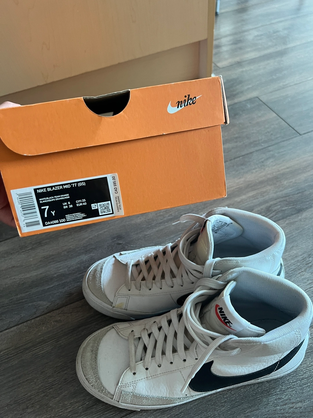 These are size 7Y, white and black Nike Blazer Mid 77 sneakers with the original box. They are a youth size.
