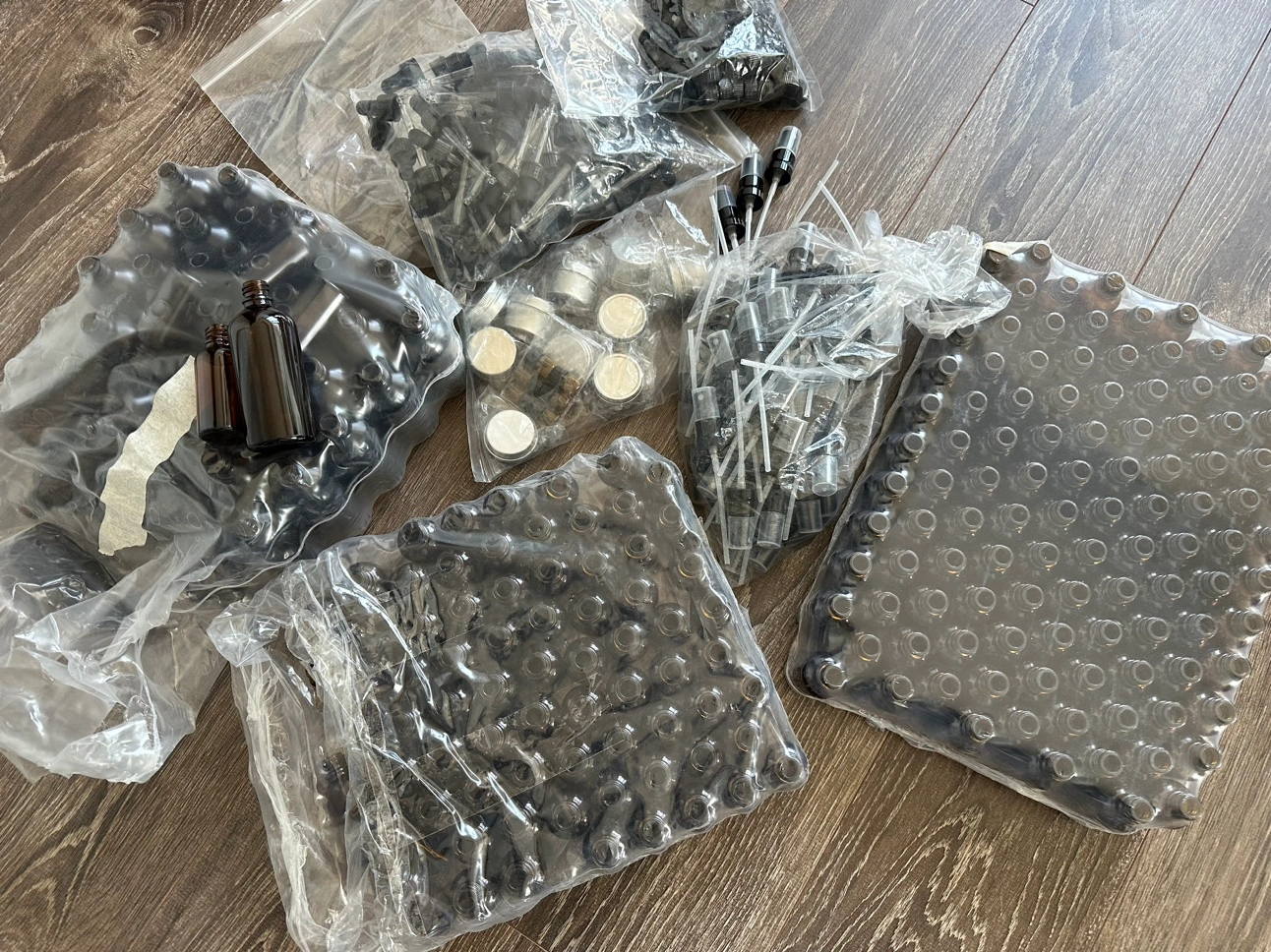 This lot includes many different sizes of amber bottles and jars, droppers, and spray tops. Please see the pictures for more detail. Great for homemade essential oil based gifts.