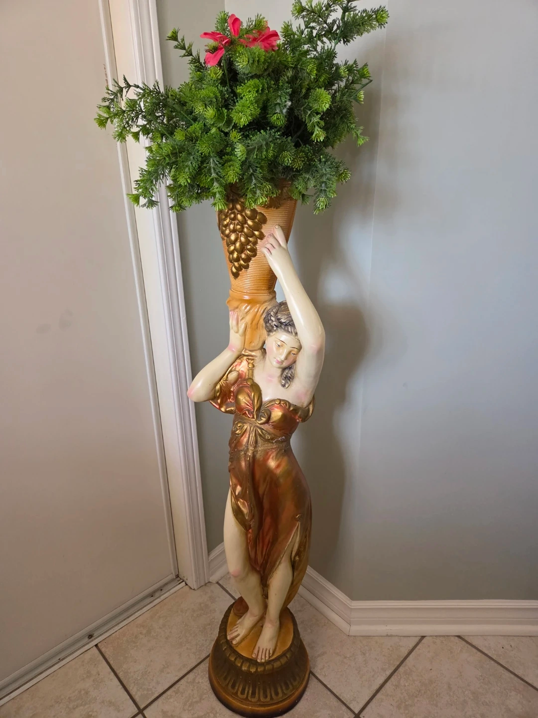 A decorative vintage statue from 1971 featuring a woman holding an urn. It includes faux greenery and a pink accent flower. This piece would add a classical touch to any room.