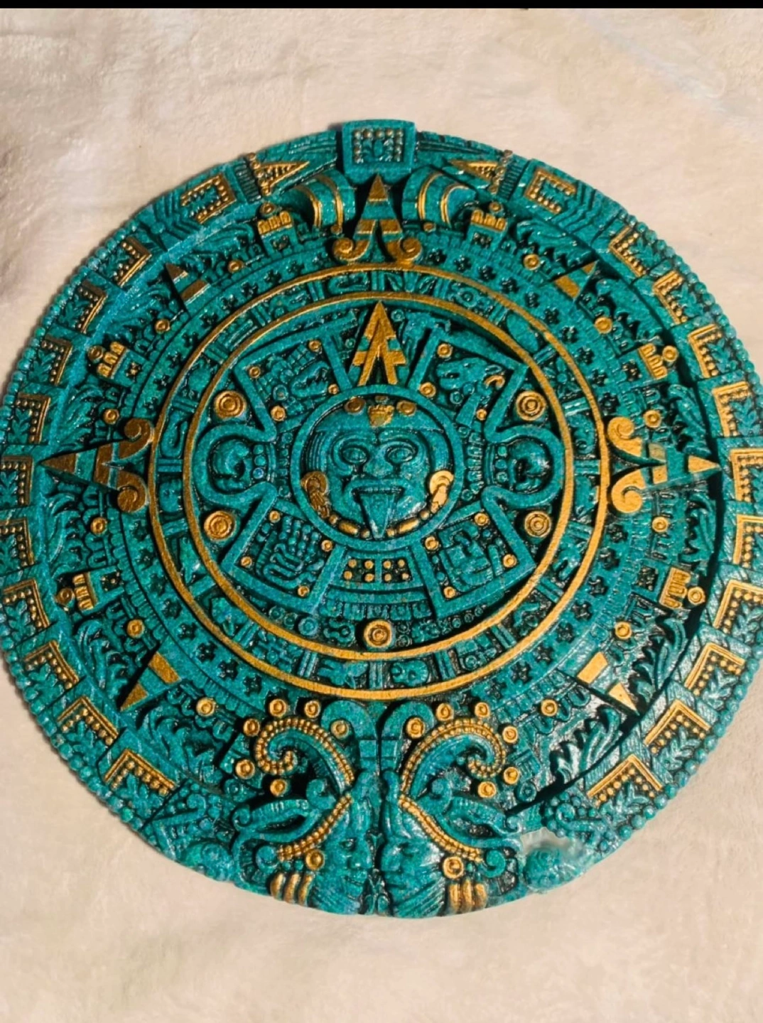 A beautifully crafted wall decor piece featuring the Aztec calendar. The decor is round and features intricate details in gold and teal.