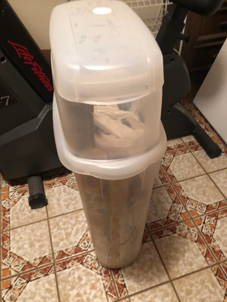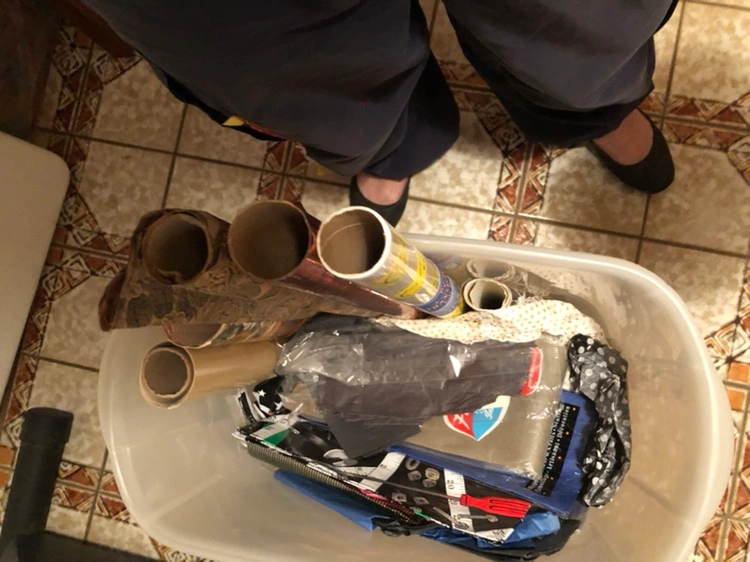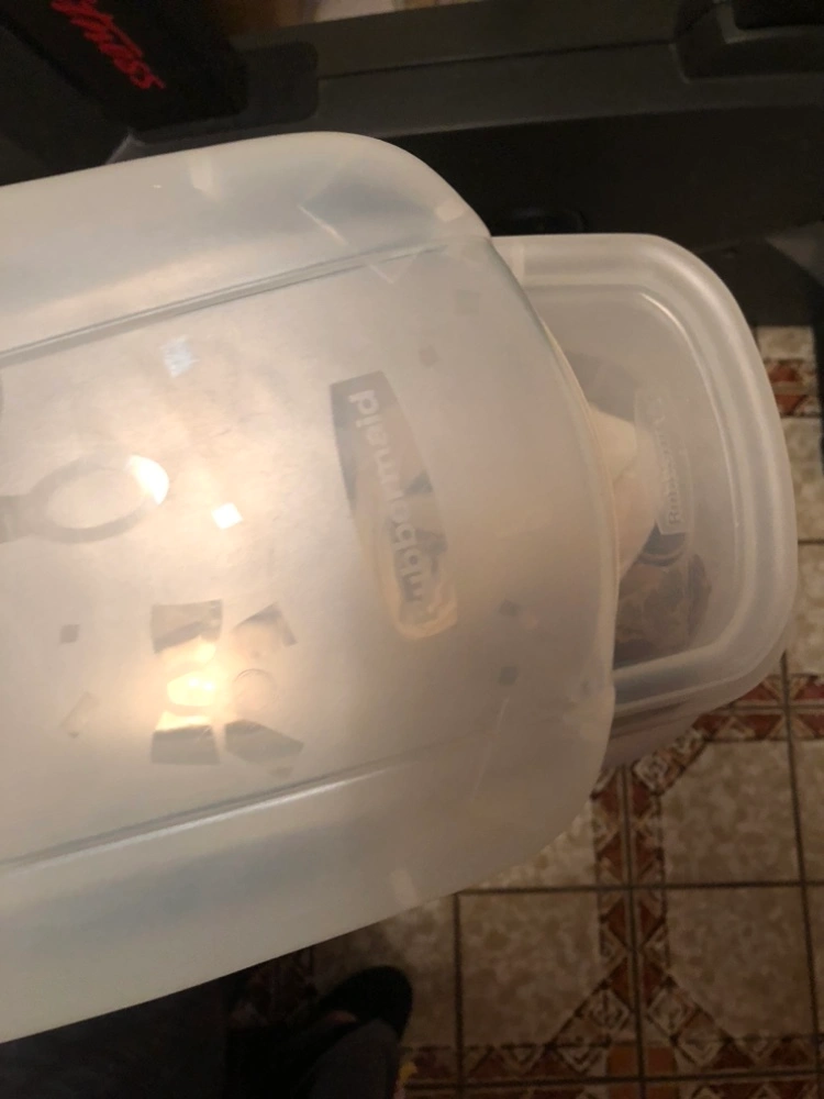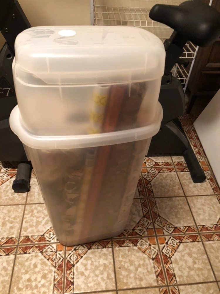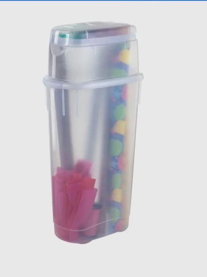 Rubbermaid Large clear plastic wrapping paper storage container with lid.