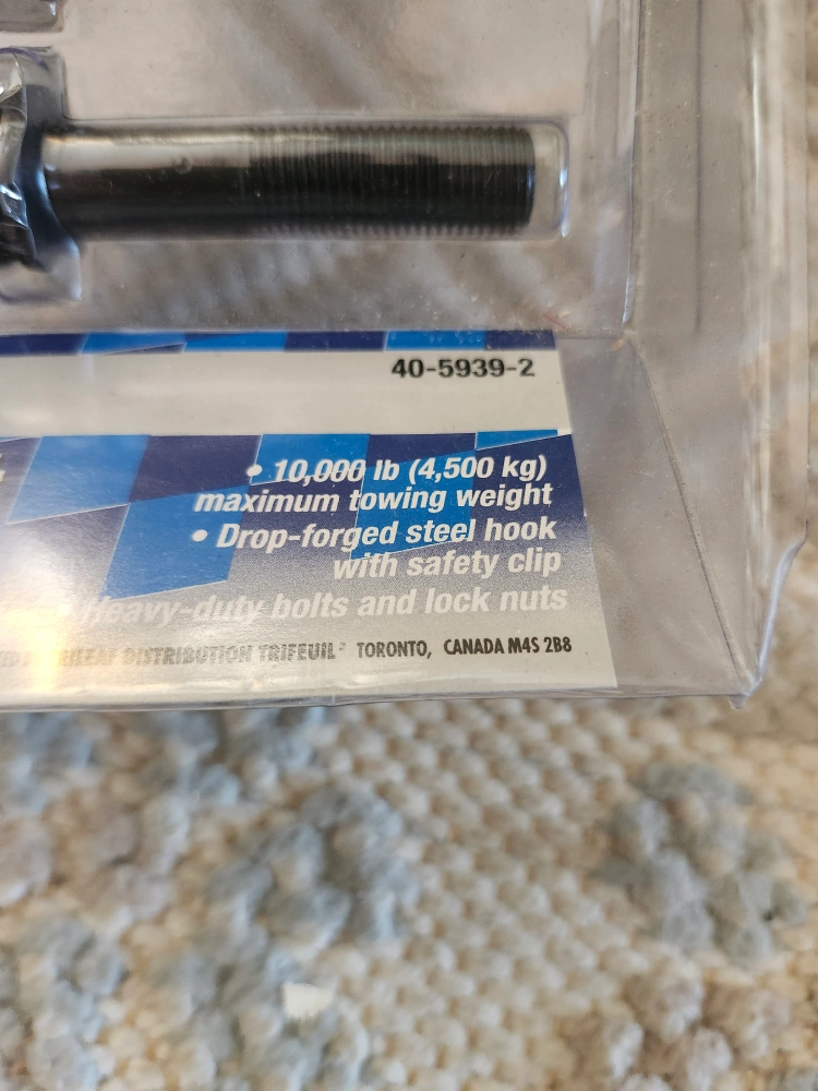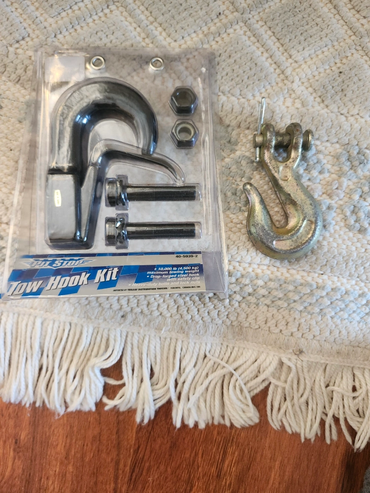 Heavy-duty drop forged steel hook with safety clip. Includes heavy-duty bolts and lock nuts. 10,000 lb (4,500 kg) maximum towing weight.with extra strap hook