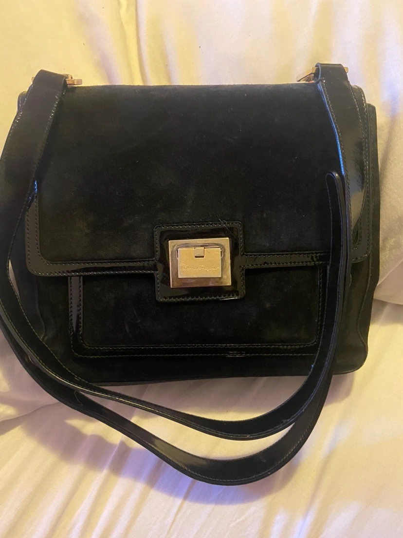 Black suede shoulder bag with gold hardware. Features a flap closure with a patent leather panel and the Salvatore Ferragamo logo. It comes with an adjustable shoulder strap. The bag has a spacious interior with a slip pocket. Perfect for everyday use or special occasions.