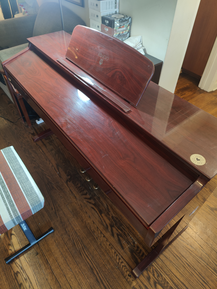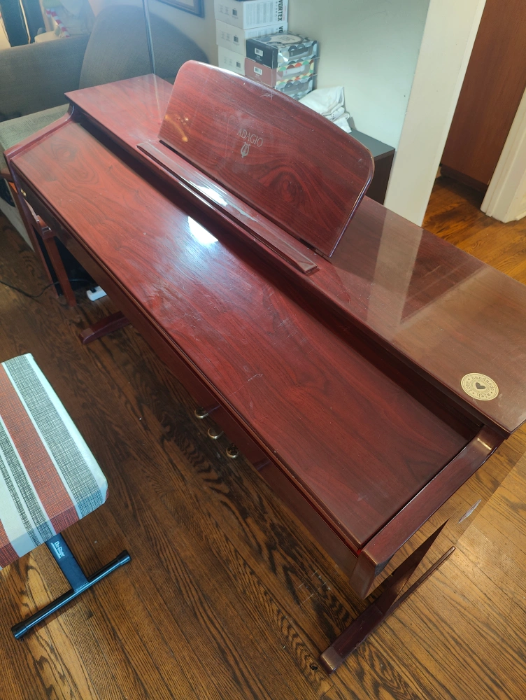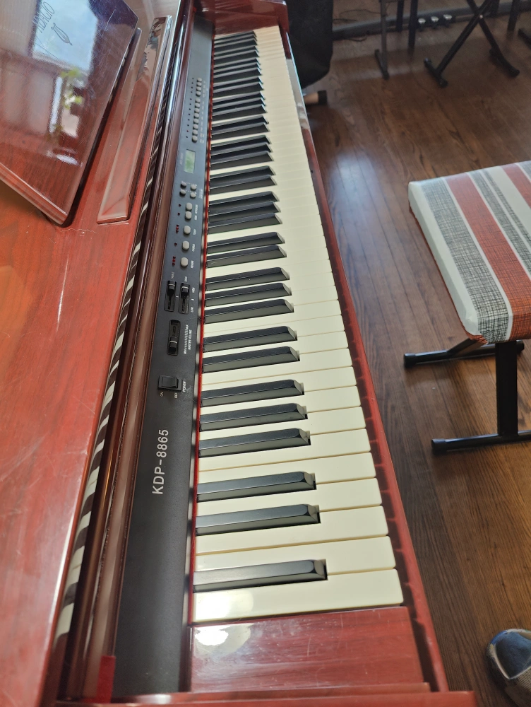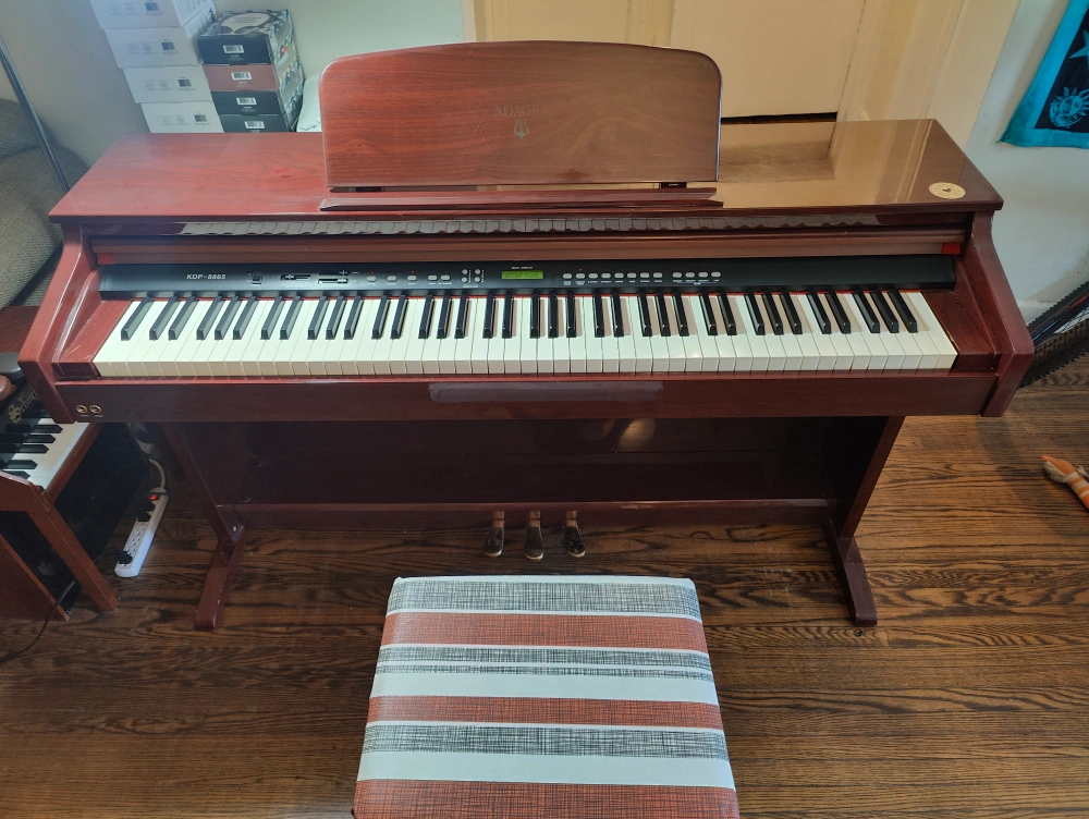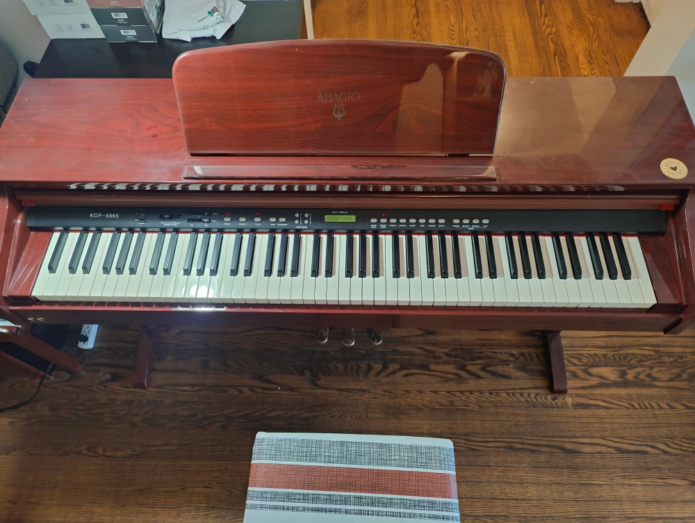 160Adagio KDP-8865, 88 fully weighted keys digital piano in perfect working condition. This beautiful piano comes with stand, music rest, power adapter, headphones, triple pedal, bench, and wooden keys cover. 6 MONTHS OF WARRANTY INCLUDED! 🎹❤️🎶 The Adagio KDP-8865 Upright Digital Piano is a full-size upright piano with a lustrous and polished classic brown finish, only found elsewhere on pianos costing three times as much. With a strong piano action with five levels of adjustment for individual touch, this piano is suited for everyone in the family. It comes with a full complement of features, such as 99 rhythms of all styles to play along with and 128 different sounds. Its four speakers, with a total capacity of 60 watts, deliver rich sound, and two headphone Jack's.