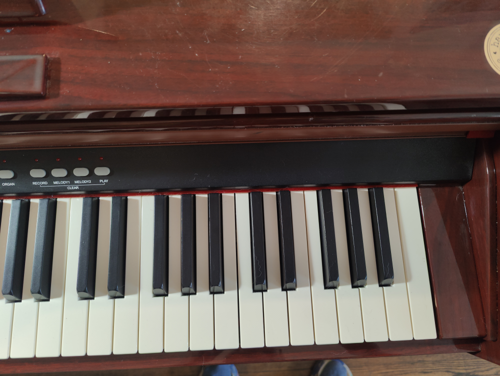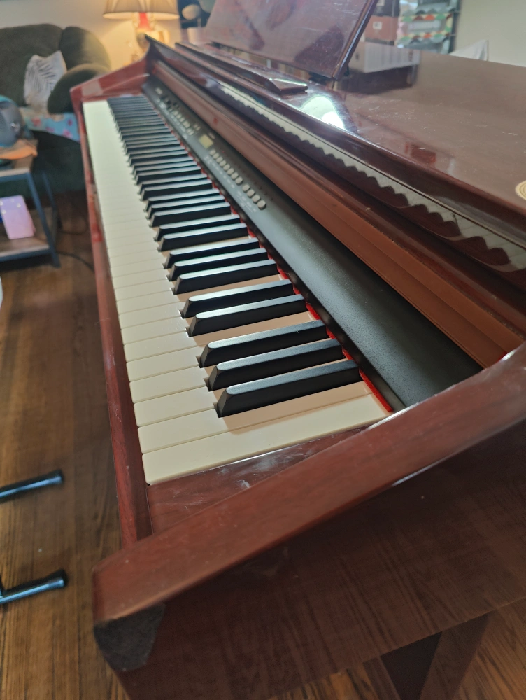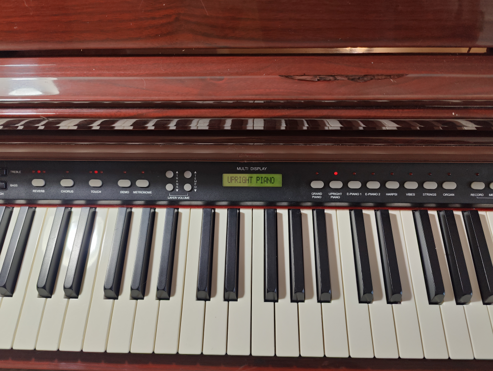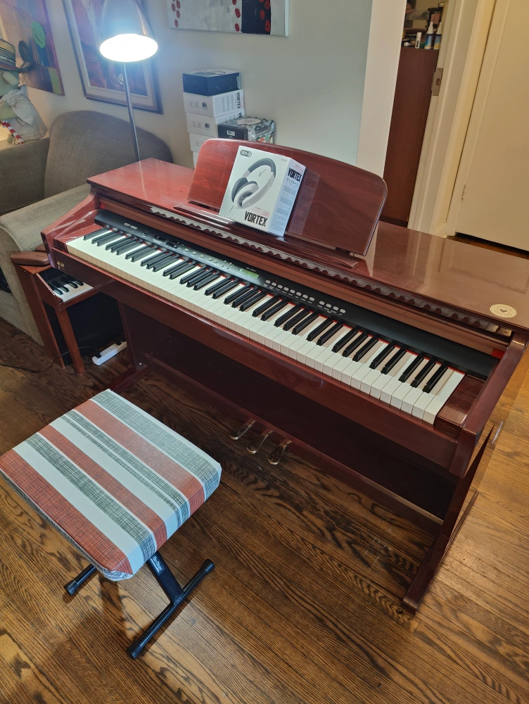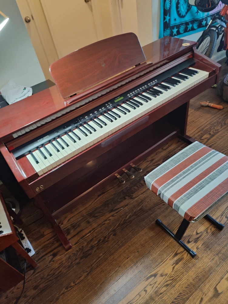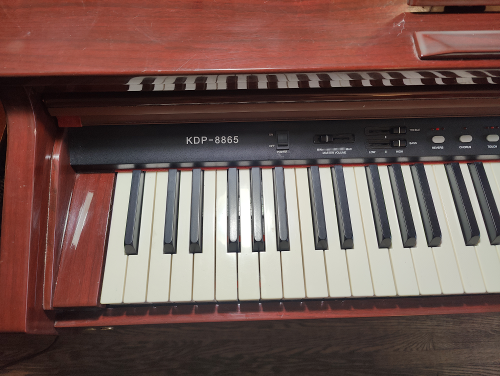 160Adagio KDP-8865, 88 fully weighted keys digital piano in perfect working condition. This beautiful piano comes with stand, music rest, power adapter, headphones, triple pedal, bench, and wooden keys cover. 6 MONTHS OF WARRANTY INCLUDED! 🎹❤️🎶 The Adagio KDP-8865 Upright Digital Piano is a full-size upright piano with a lustrous and polished classic brown finish, only found elsewhere on pianos costing three times as much. With a strong piano action with five levels of adjustment for individual touch, this piano is suited for everyone in the family. It comes with a full complement of features, such as 99 rhythms of all styles to play along with and 128 different sounds. Its four speakers, with a total capacity of 60 watts, deliver rich sound, and two headphone Jack's.