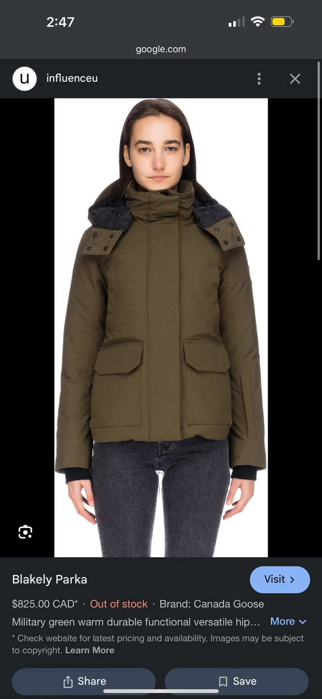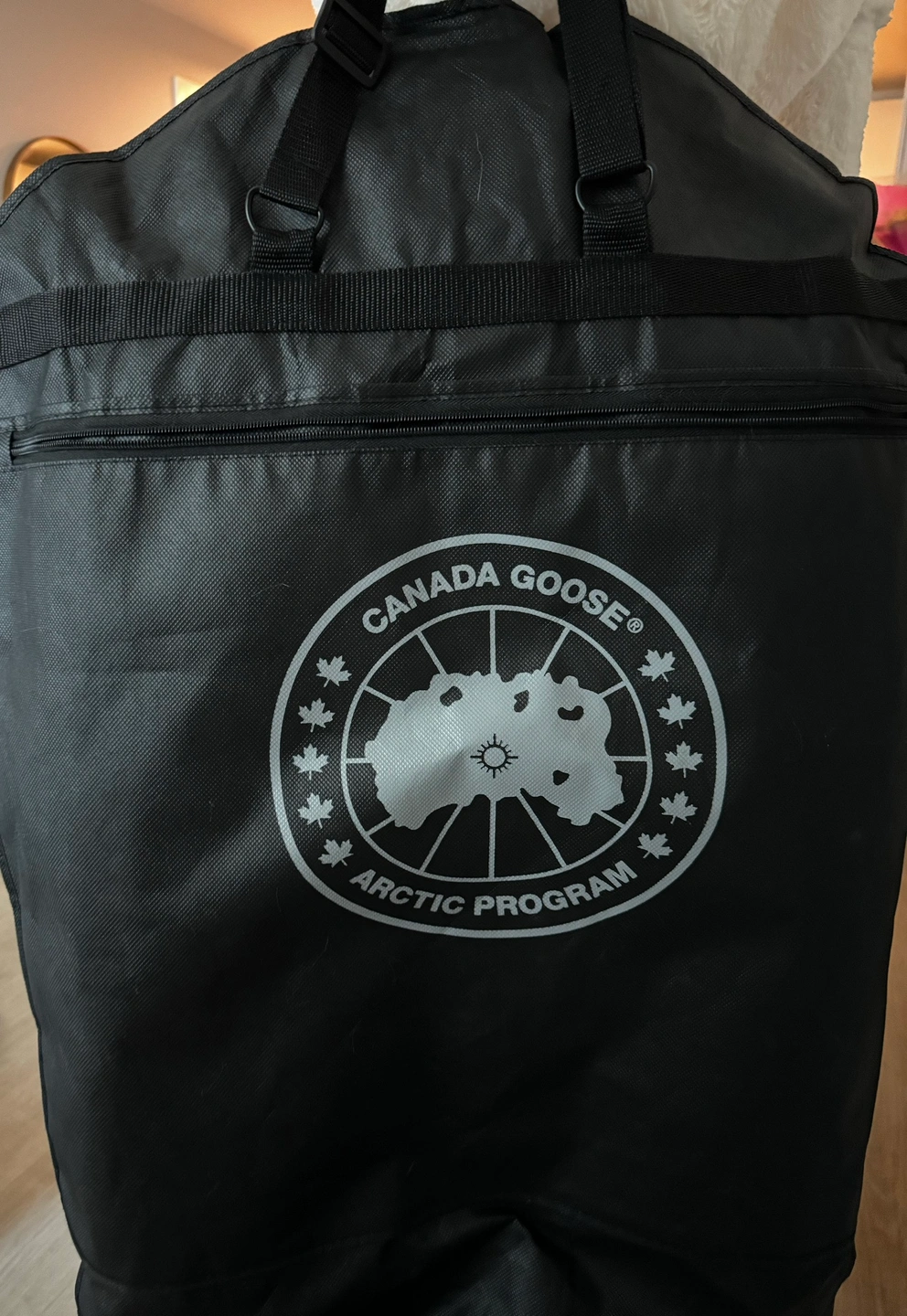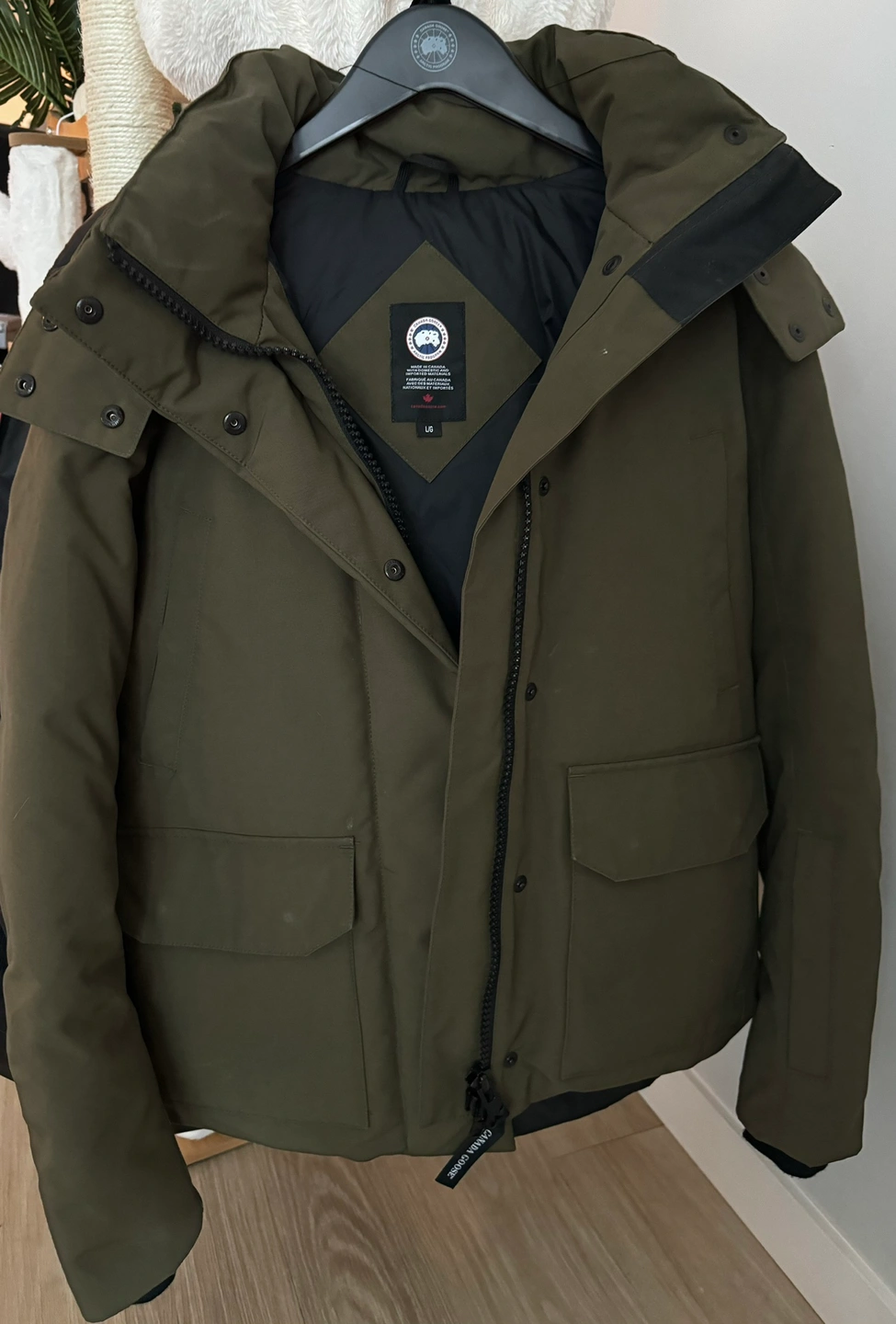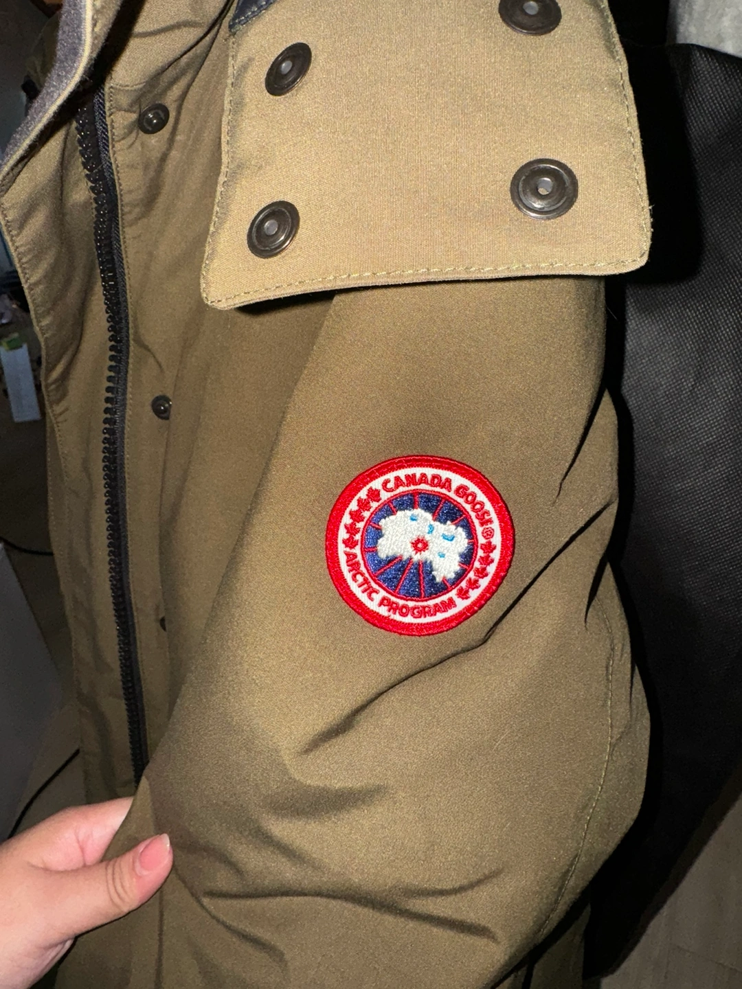 Military green warm durable functional versatile hip length hooded down parka. Two-way front zip closure. Six front hidden snap button storm flap closure. Wind flap under front zipper. Removable two-way adjustable diamond quilted lined hood with four adjustable hidden snap button collar closure and visor. Water resistant. Wind resistant. Brushed tricot chin guard. Slightly elongated back. Articulated sleeves. Inner recessed ribbed storm cuffs. Front fleece lined two hidden snap button flap patch pockets. Front fleece lined slit pockets. Welted slanted fleece lined hidden snap button chest pockets. Interior zip security pocket. Interior stretch mesh drop-in pocket. Interior shoulder straps. Welted zip pocket on left sleeve. Canada Goose woven disc logo on left sleeve.