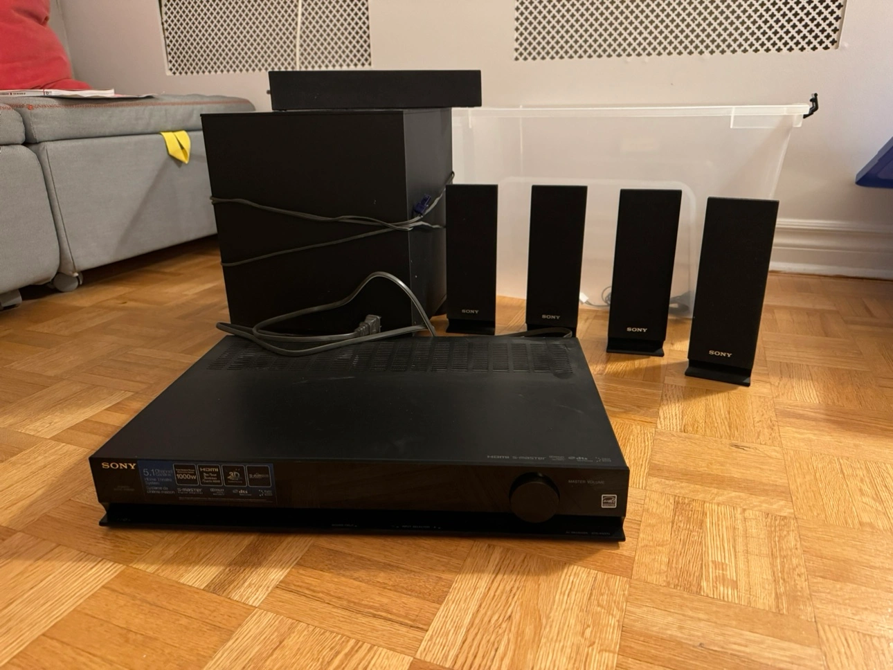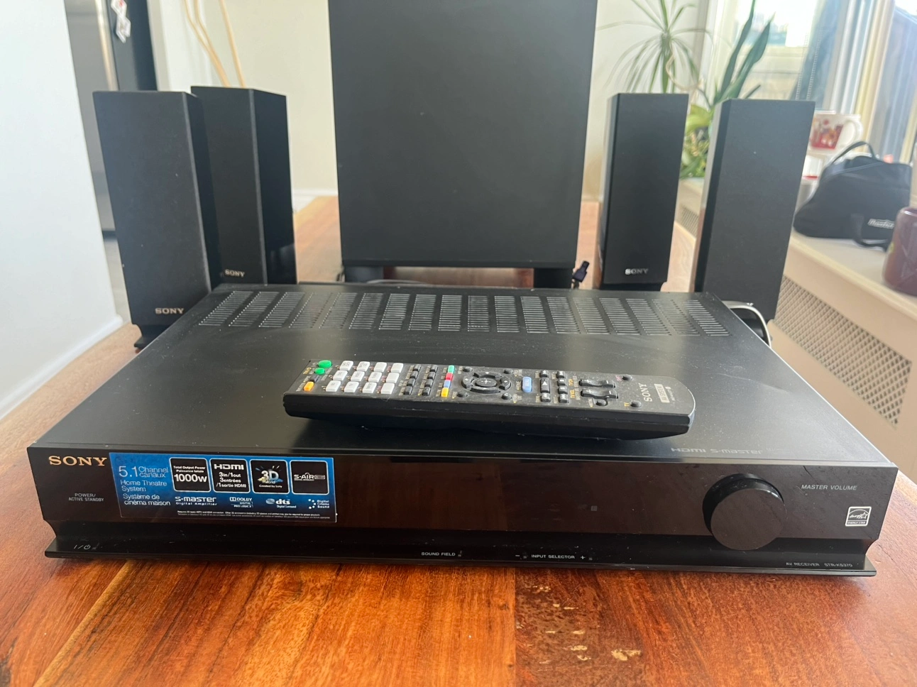 Sony Home Theatre system with a receiver, subwoofer, and four speakers.