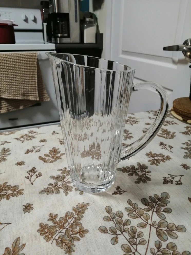 A glass pitcher with a handle. It has a ribbed design. New, never used. Kind of heavy. Cash only. Meet in the Cornell area or meet at a mutually convenient location.
